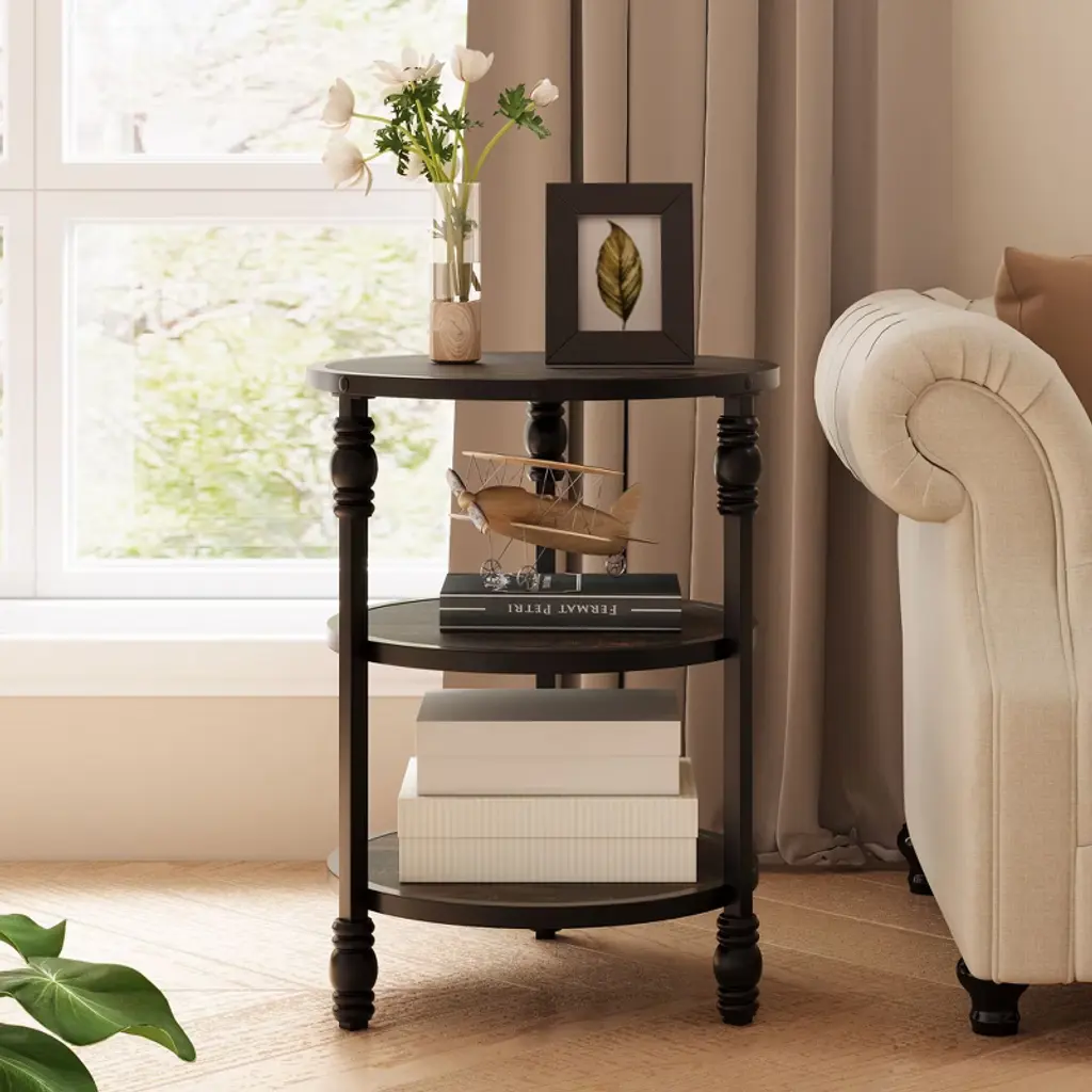 ELEGANT VINTAGE STYLE: The side table combines natural wood grain finish boards with thickened Roman column table legs to emphasize its carving's side elegant lines and great craftsmanship in details, which showcases a vintage glam style and creates a stylish and luxurious vibe, making it an elegant and timeless eye-catcher to fit perfectly with almost all other furniture items. It is not just a side table, but a decoration artwork, that adds an elegant touch to your living room or bedroom. ROBUST BUILD: Our end table is crafted from high-grade MDF engineered wood and heavy-duty metal, ensuring it's sturdiness and durability. The waterproof thickened tabletop provides excellent stability, allowing the side table to bear up to 150 lbs, which is more than sufficient for your needs. The thickened metal legs of the side table ensure that it is stable and does not shake. 3 Adjustable footpads are designed for leveling or uneven, and protect your tile and wood floors from scratches. MULTIFUNCTIONAL END TABLE: The height of the end table is designed to match most sofas and beds, making it an ideal choice as a sofa side table, bedside table, nightstand, end table, or accent table. It is suitable for use in a bedroom, living room, office, small spaces, or any other area. The bedside table features an attractive design that combines industrial, contemporary, and retro styles, making the nightstand compatible with any home decor and furniture. SPACIOUS STORAGE: The round end table overall size is 18.1”L x 18.1”W x 23.6”H; The 3 tiers storage shelves structure makes it a larger storage space. Teacups, decorations, books, phones, drinks, and other items are within arm's reach and help keep the living area away from clutter. The wooden grain desktop is waterproof and very easy to clean. With high-quality materials and excellent craftsmanship, the accent table can withstand extended use without fear of wear and tear. EASY to ASSEMBLY: This round end table has been checked and is well-packed before shipping. You don't need to worry about assembly, the living room side table comes with detailed installation instructions, parts and accessories are labeled with numbers, and precise holes make installation accurate and fast. 1 person can assemble in about 15 minutes. If you have any questions before or after your purchase, you can always email us, and we always reply within 24 hours.