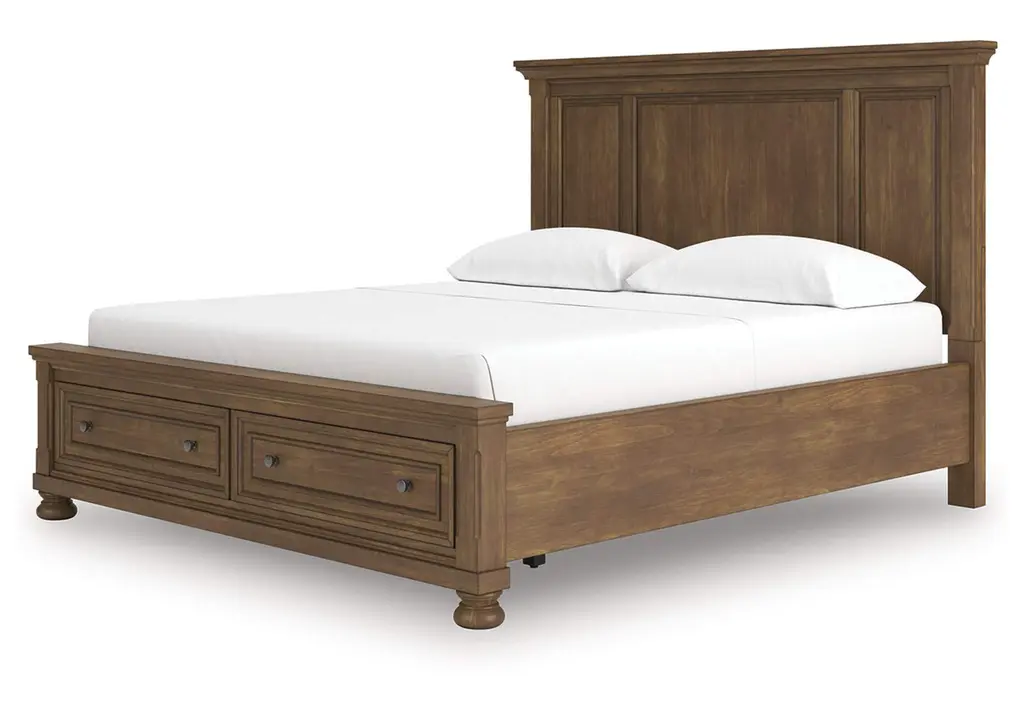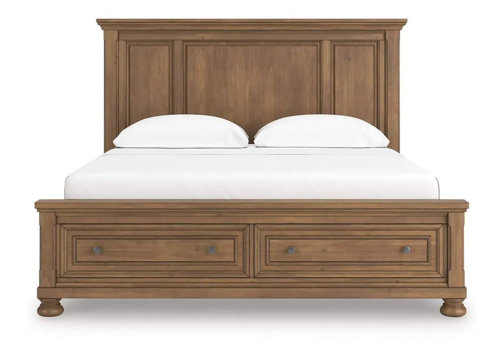 A relaxed take on casual traditional design, this California king panel storage bed strikes a comfy pose with a classic sensibility. Its timeless design and chestnut brown wood tone create a welcoming retreat tailored to your laid-back lifestyle. Metal knobs in an aged pewter color subtly dress up footboard drawers packed with storage possibilities. Now there’s a bed with staying power. Weight 327.350 lbs. (147.31kgs.)