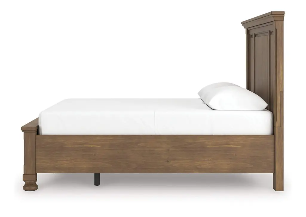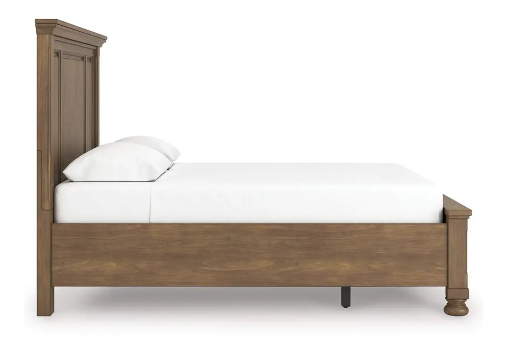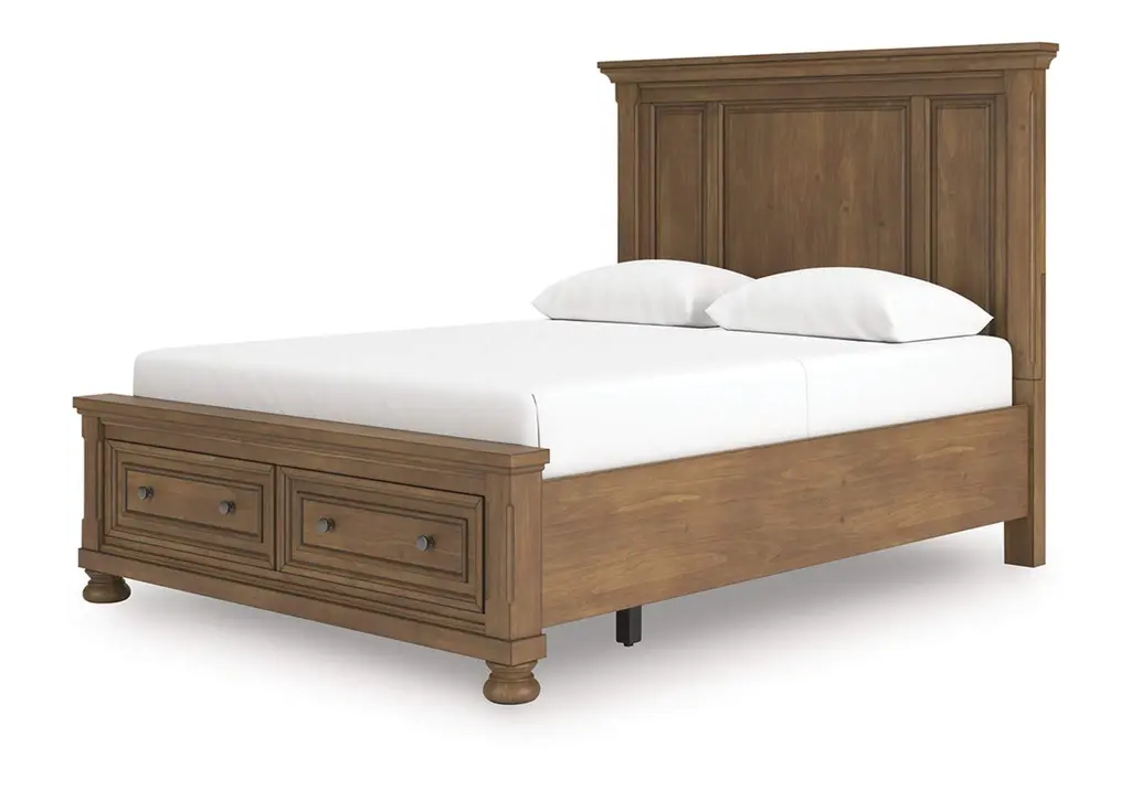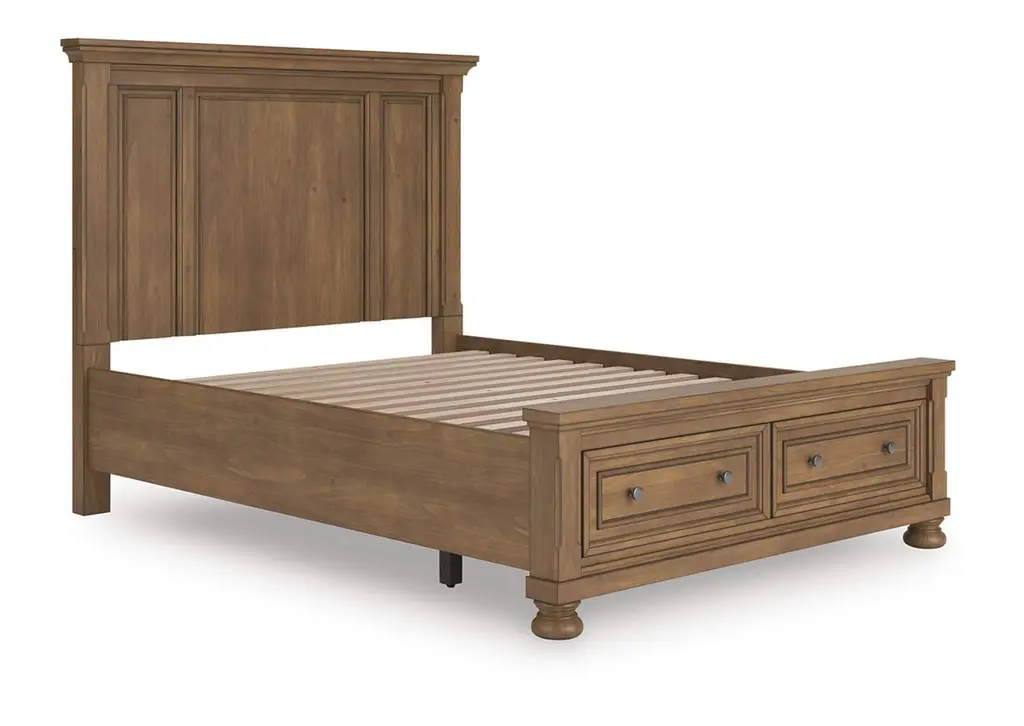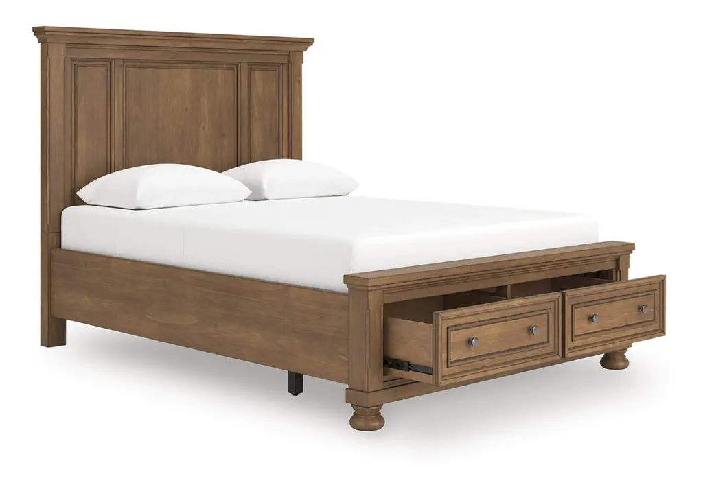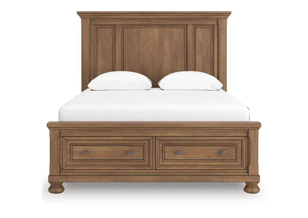 A relaxed take on casual traditional design, this queen panel storage bed strikes a comfy pose with a classic sensibility. Its timeless design and chestnut brown wood tone create a welcoming retreat tailored to your laid-back lifestyle. Metal knobs in an aged pewter color subtly dress up footboard drawers packed with storage possibilities. Now there’s a bed with staying power. Weight 278.000 lbs. (125.1kgs.)