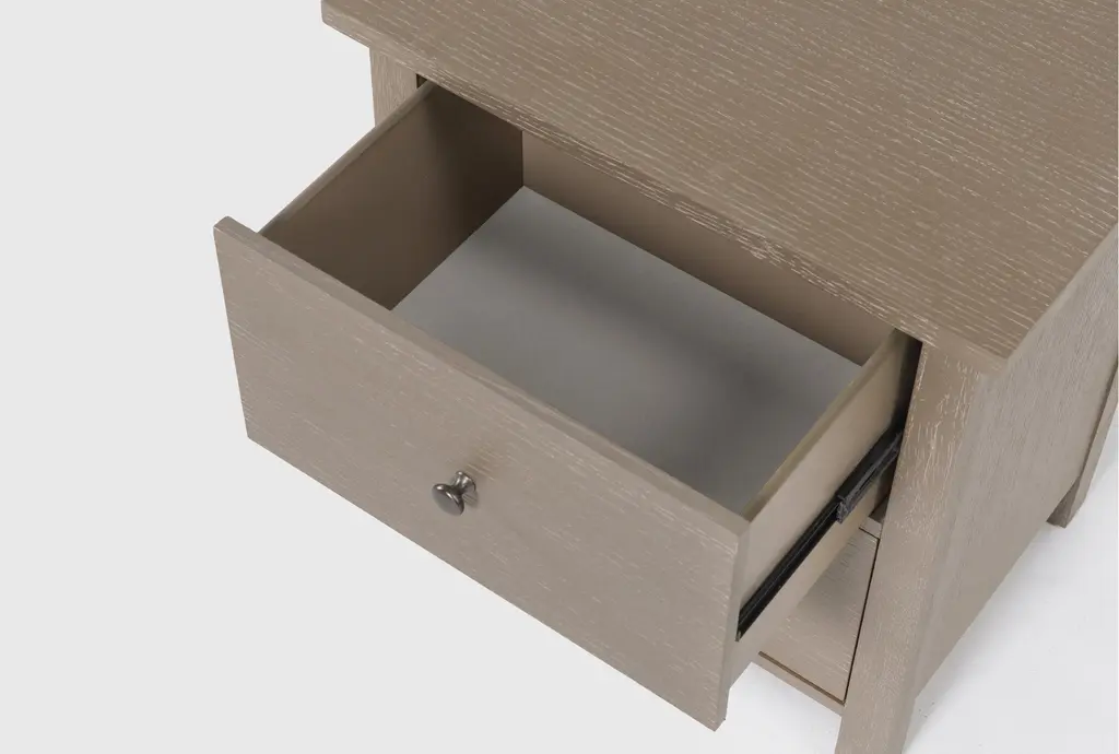 The Felipe Driftwood Full Storage Bed Set with 2 Drawer Nightstand Set of 2 brings casual style and functionality to any kid's room. Featuring a driftwood finish, this full-size bed set includes a platform bed with storage drawers, providing ample space to keep belongings organized. Crafted with oak veneers and solid rubberwood, this bed set is both durable and stylish.