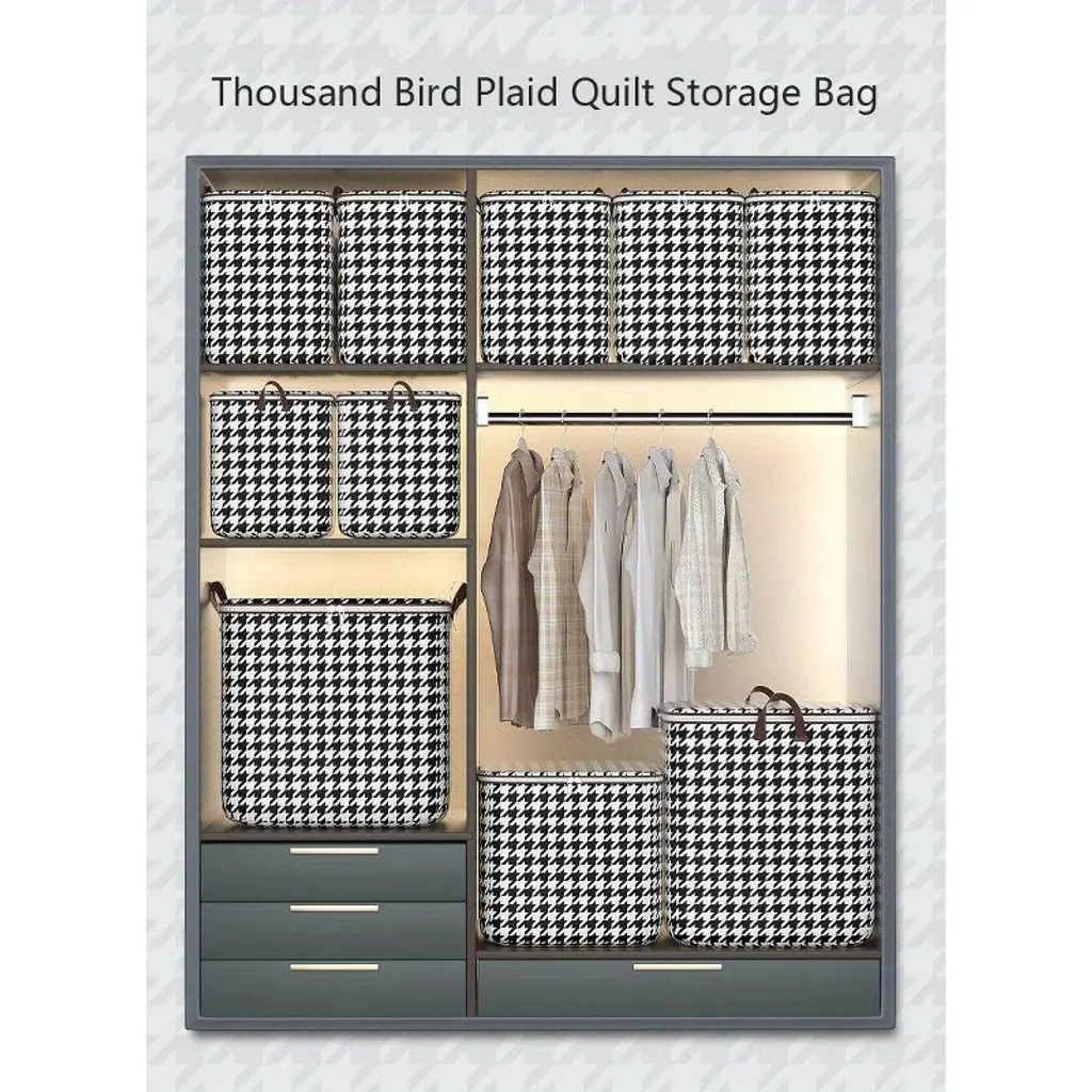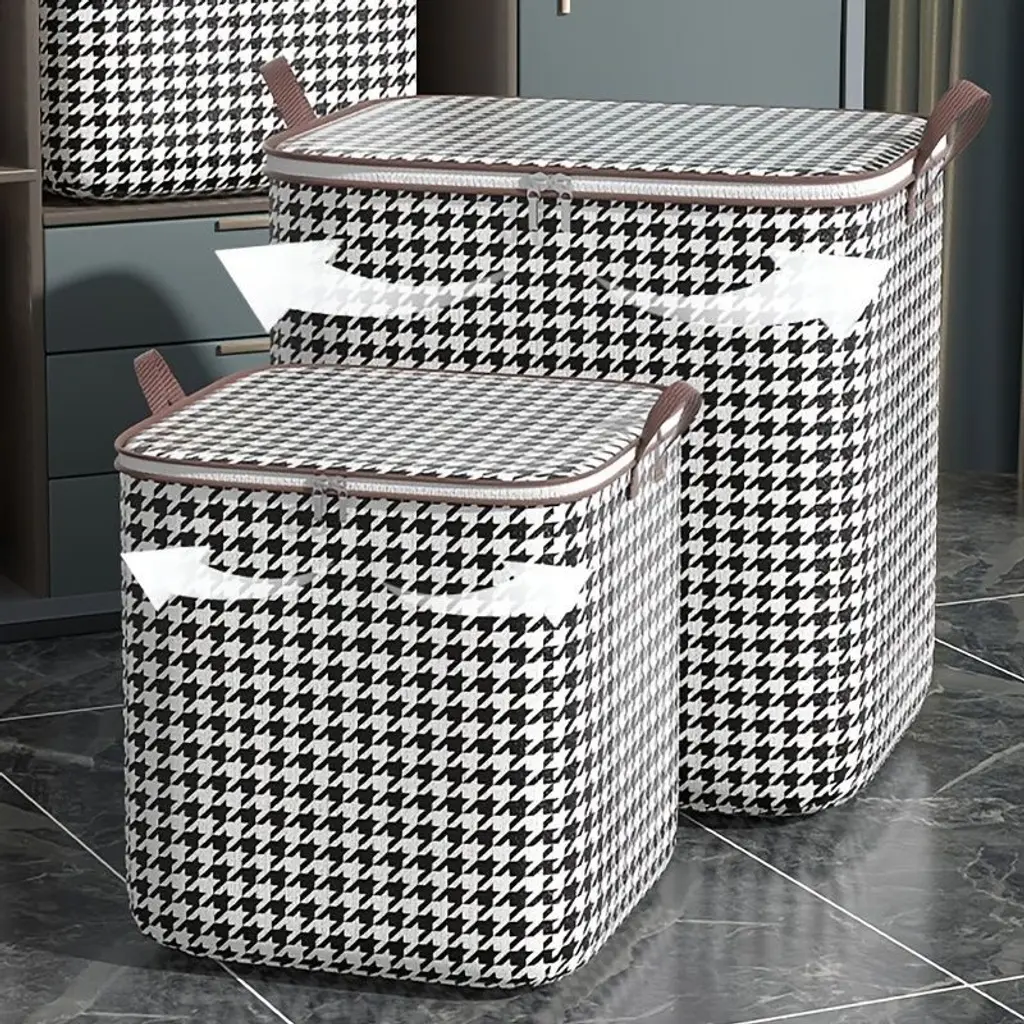 Simplify your home storage with this upgraded foldable fabric storage bag. Designed for high capacity and ease of use, this waterproof and moisture-proof bag is perfect for storing quilts, clothes, blankets, and other bulky seasonal items. Featuring a classic Thousand Bird Plaid pattern, a smooth bi-directional zipper, and reinforced side handles, it offers convenient access and portability while optimizing your closet or under-bed space. Made from durable non-woven fabric, this storage bag keeps your items safe, dry, and organized — whether you're decluttering, moving, or storing off-season bedding.