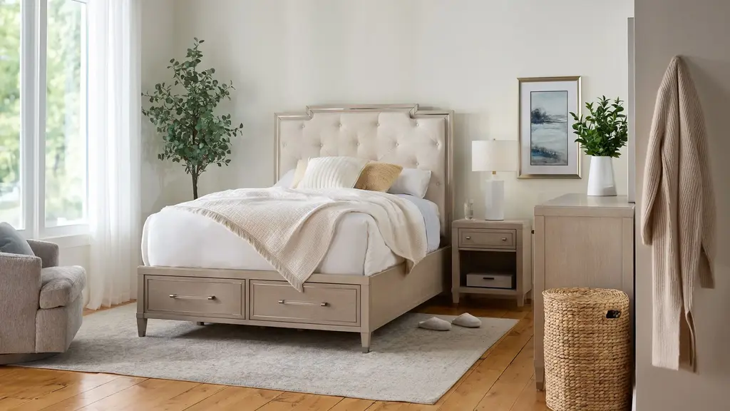 The beautifully crafted Francesca storage bed features solid wood construction with a timeless light oak finish and tufted upholstered headboard for a casually elegant vibe. Elevate your bedroom with this platform bed featuring 2 built-in drawers so you can easily reduce bedroom clutter. You'll also appreciate the USB charging ports conveniently located in the headboard!