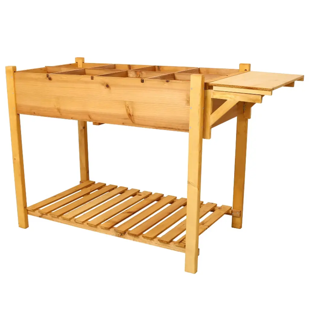 Elevate your gardening with the Gulches 8 Pockets Horticulture Raised Garden Bed! This innovative wood planter box features eight spacious pockets for diverse plant growth. The added foldable side table provides extra workspace, while the storage shelf keeps your tools organized and within reach. Perfect for any garden space, this elevated design ensures easy access and promotes healthy plant development. Transform your gardening experience today!