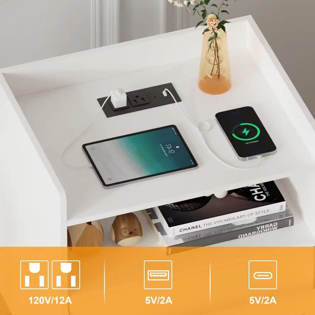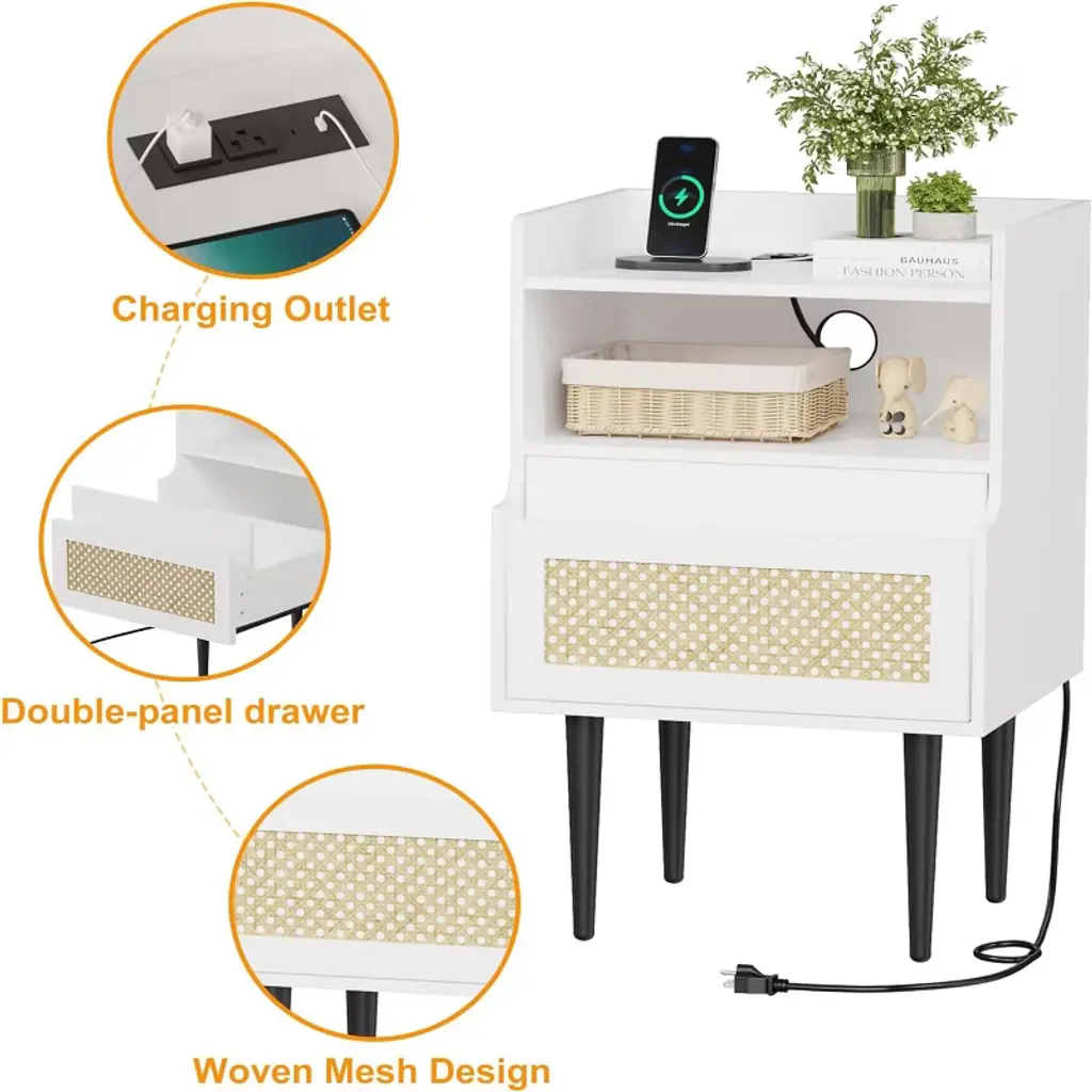 Gustowave Nightstands Set Of 2, Natural Rattan End Table With Charging Station, With Drawer And Storage Shelf For Bedroom, White