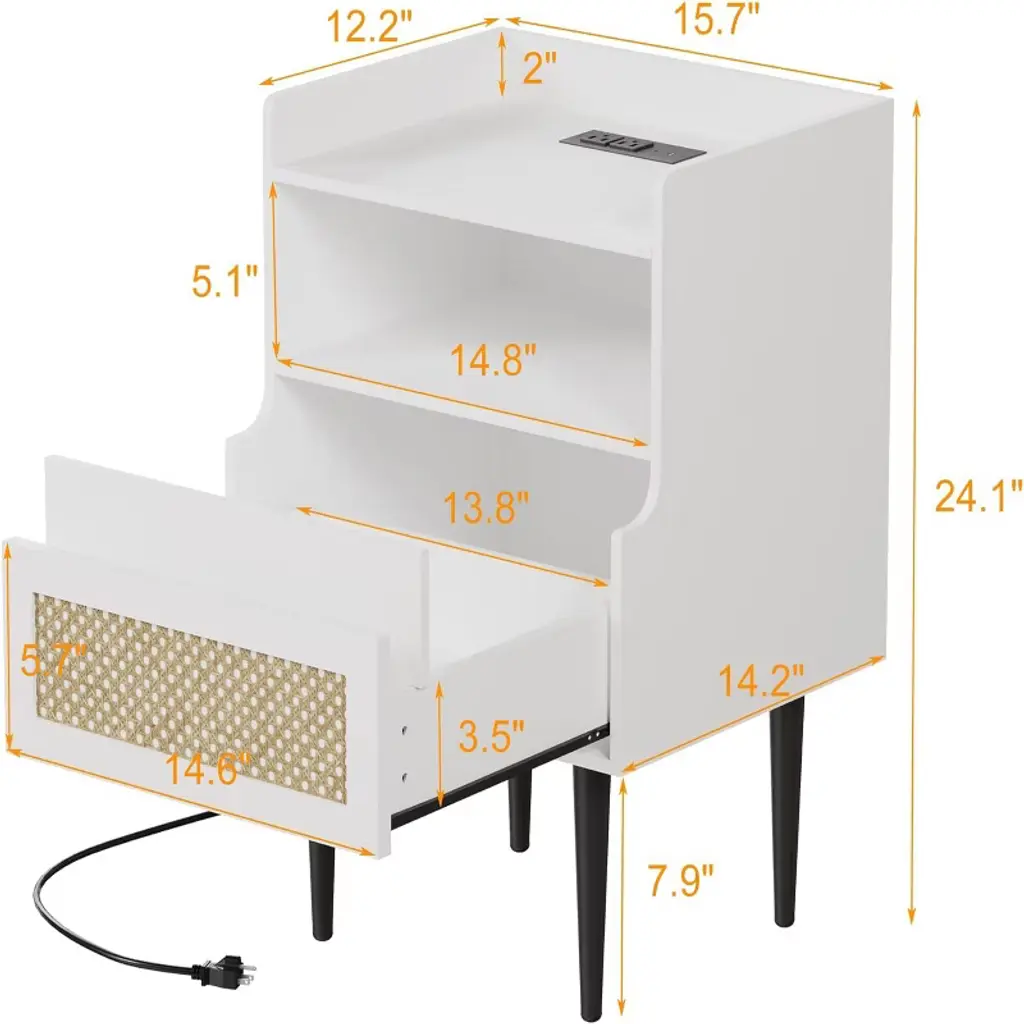 This Compact Rustic Farmhouse Nightstand Features Built-In Outlets And Usb Ports For Convenient Device Charging, Organized Rattan Drawer And Open Shelves For Bedtime Essentials, A Small Footprint Ideal For Tight Spaces, And Easy Tool-Free Assembly With Clear Instructions.
