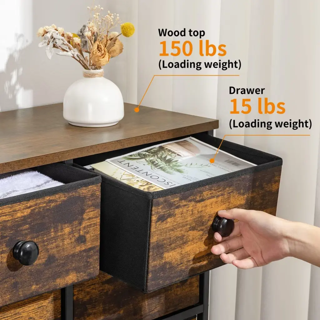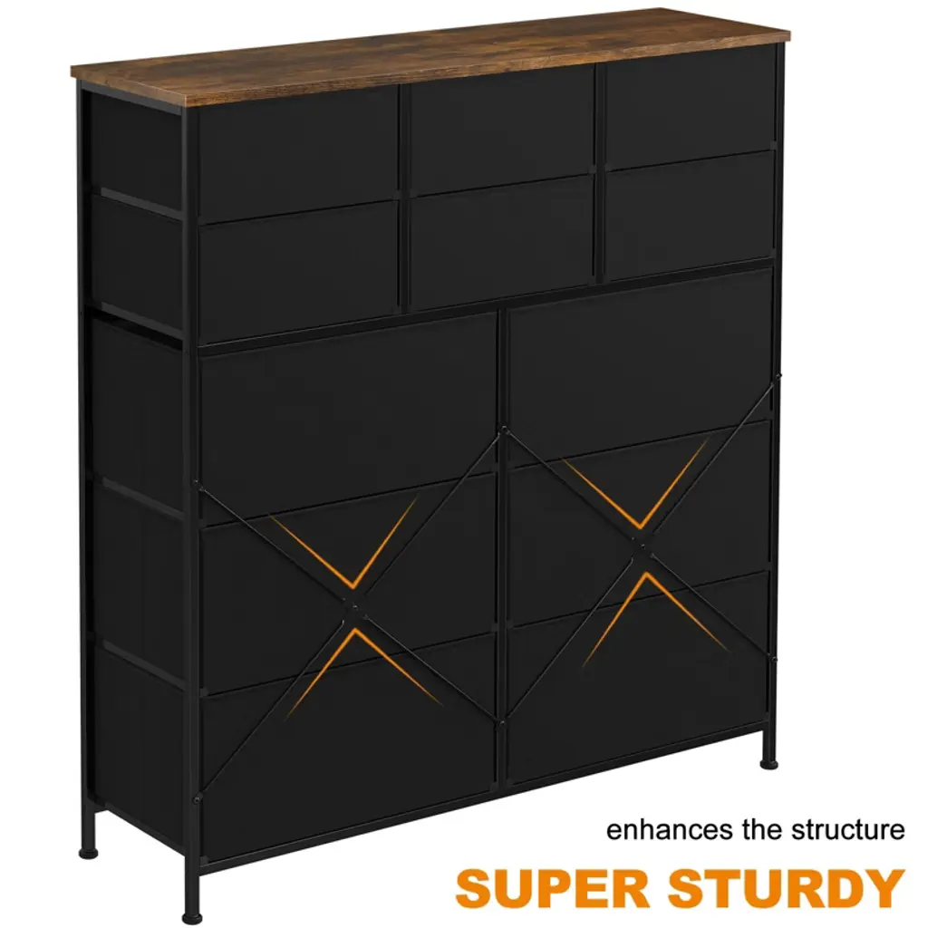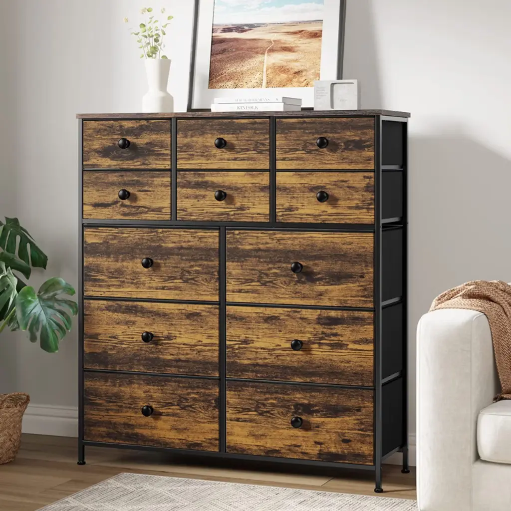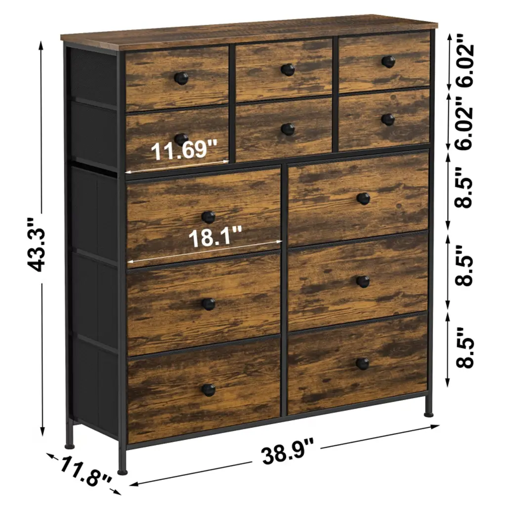 The Hausource 12-Drawer Dresser provides versatile storage with a stylish rustic brown or black grey finish. Built with a sturdy steel frame and MDF top, it offers ample space for organizing items in any room, from bedrooms to offices.