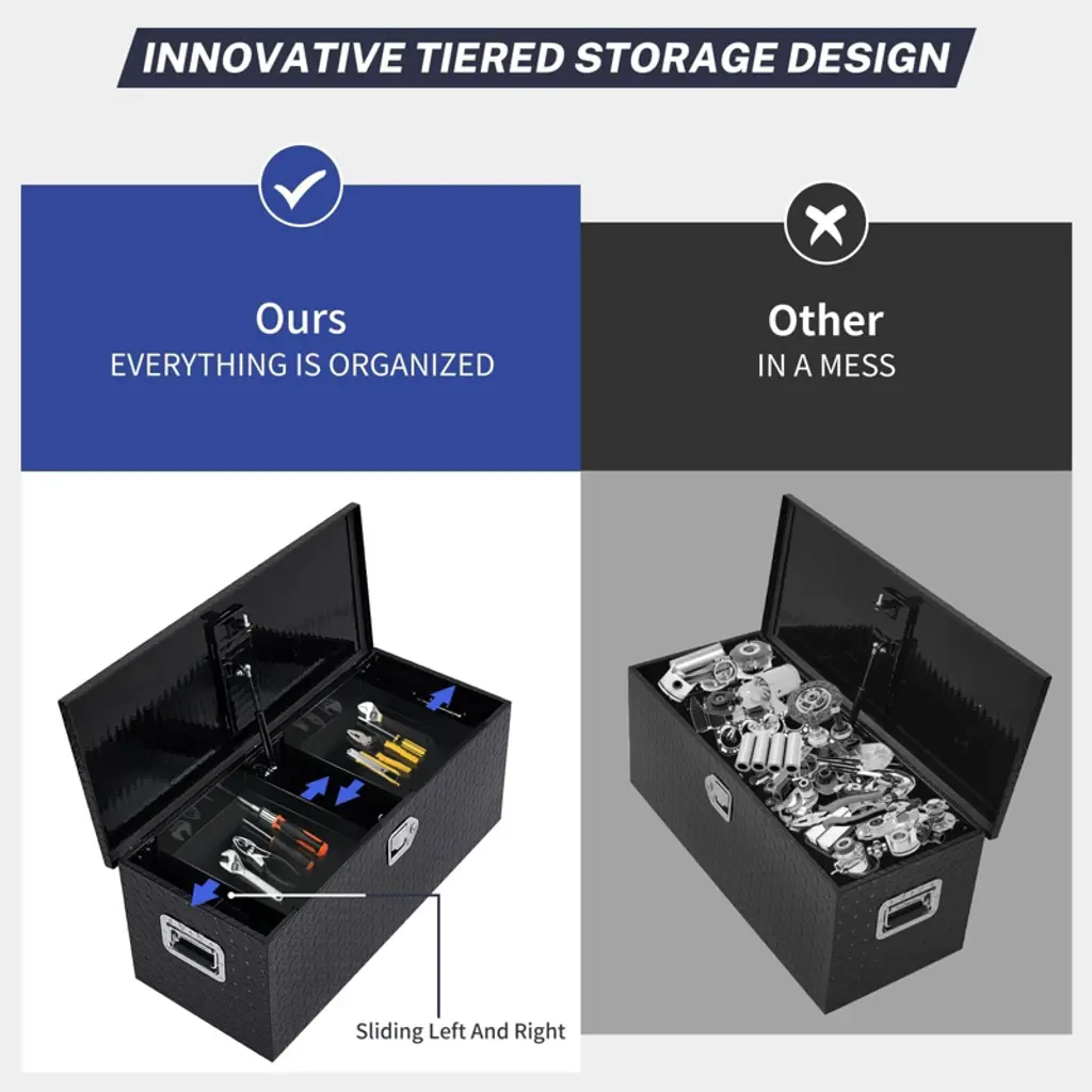 Truck Tool Box & Aluminum Tool Chest | Heavy-Duty Lockable Storage for Pickup Beds?Product Description:Secure and organize your gear with a heavy-duty aluminum tool box designed for the toughest jobs. This robust storage chest is engineered specifically for truck beds, RVs, and trailers, offering a secure, weather-resistant haven for your valuable tools and equipment. Constructed from high-quality, rust-proof aluminum with a protective finish, it stands up to harsh conditions and heavy use. The spacious interior provides ample room for everything from power tools to emergency gear, while the integrated lock and side handle ensure security and easy portability. Designed for a universal fit and simple installation, it¡¯s the ultimate storage upgrade for professionals and DIY enthusiasts.?Key Features:1. Heavy-Duty Rust-Proof Aluminum ConstructionBuilt from premium, weather-resistant aluminum, this tool box is made to last. The robust material, combined with a durable protective finish, effectively resists rust, corrosion, and UV damage, ensuring long-term reliability and performance in any environment.2. Secure Locking System & Integrated Carry HandleKeep your equipment safe from theft with a reliable, key-operated lock built directly into the box. A sturdy side handle is seamlessly incorporated into the design, providing a solid grip for easy lifting and maneuvering, making transport and setup both simple and secure.3. Spacious & Highly Versatile Storage CapacityWith a generously sized interior, this chest offers versatile storage for a wide array of items. Neatly organize professional tools, automotive supplies, or outdoor gear. Its intelligent design makes it an ideal, all-in-one storage solution for work sites, road trips, and daily use.4. Universal Vehicle Compatibility & Easy InstallationEngineered to fit perfectly in most standard pickup truck beds, trailers, and RVs. The straightforward, no-hassle installation process allows you to quickly enhance your vehicle¡¯s storage capacity and hit the road with your tools organized and protected.5. Multiple Size & Configuration OptionsAvailable in several sizes and layouts to meet your specific needs. Choose from various lengths and select models that include built-in small compartments for organizing smaller items like screws and fittings, allowing for a completely customized storage system.