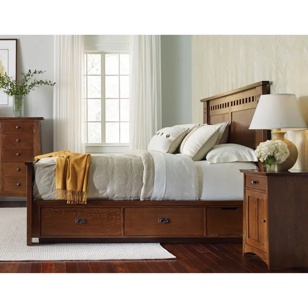 The bed is a stylish centerpiece for the bedroom featuring an overhanging prairie top, a burned-in laser motif, and pierced squares on the headboard.