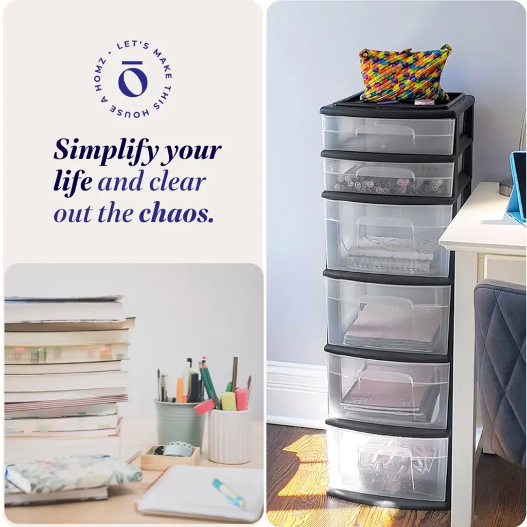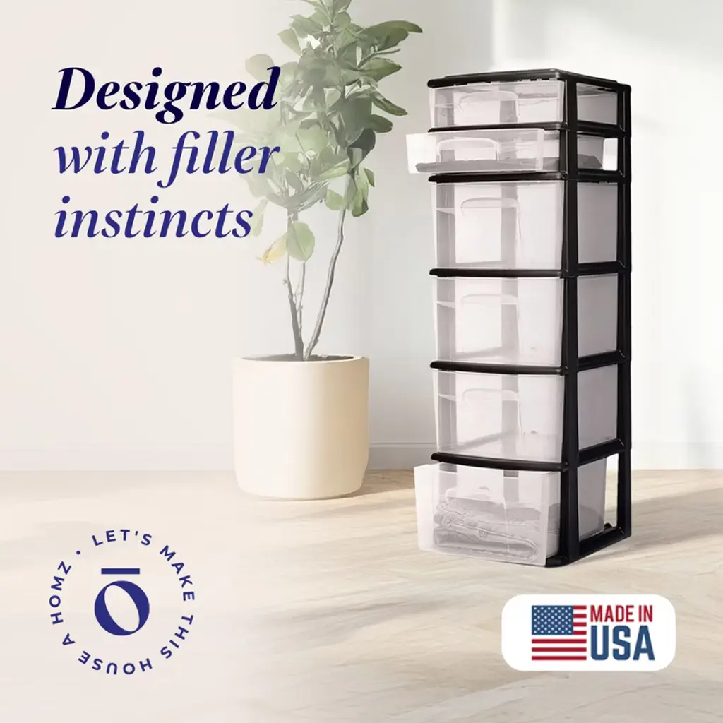 Your kitchen junk drawer isn't doing you any favors. Organize your random clutter with help from Homz Plastic 6 Clear Drawer Container Tower. Equipped with 2 small and 4 large drawers, this multi-purpose organizer unit is perfect for storing small to medium-sized items. Whether you place it in the bathroom, your bedroom, the laundry room, or kitchen, make use of this convenient storage organizer. The heavy-duty black plastic frame keeps the 6 drawers in place so you can store everything from shoes and clothing to art supplies and holiday decorations. The clear drawer design makes it easy for you to quickly identify the contents without having to remove or open the container. A top recessed lid makes it easy to keep small items in place without rolling off. Measuring 12.5 inches long, 14 inches wide, and 39 inches tall overall, the large drawer measures 12.3 inches long, 10 inches wide, and 7 inches tall. On the other end, the small drawers measure 12.3 inches long, 10 inches wide, and 3 inches tall.