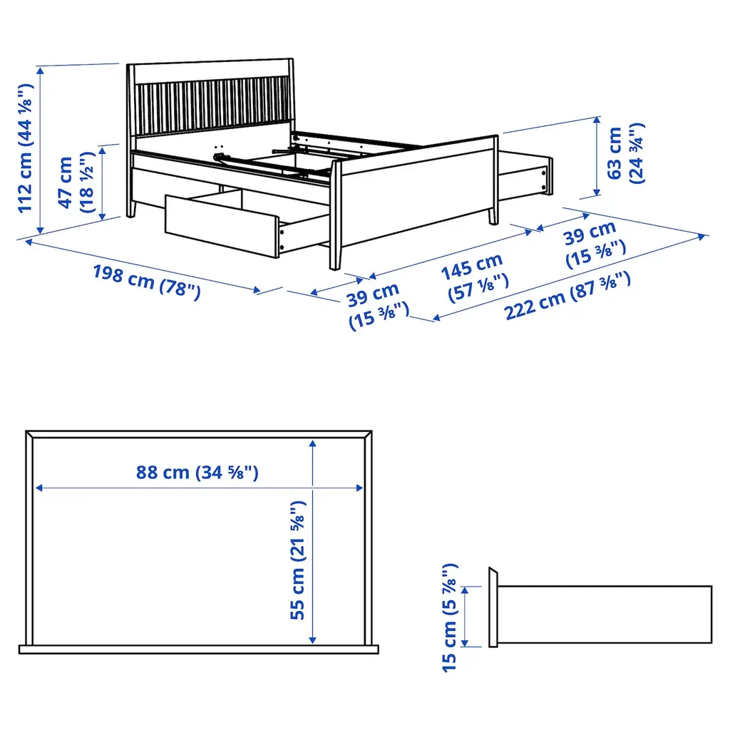 IDANÄS Bed frame with storage - white/Lönset Full/Double. 4 spacious drawers under the bed make the best use of the space. They are great for storing extra duvets, pillows and bed linens – or your clothes. The drawers close silently and softly, thanks to the integrated soft-closing function.