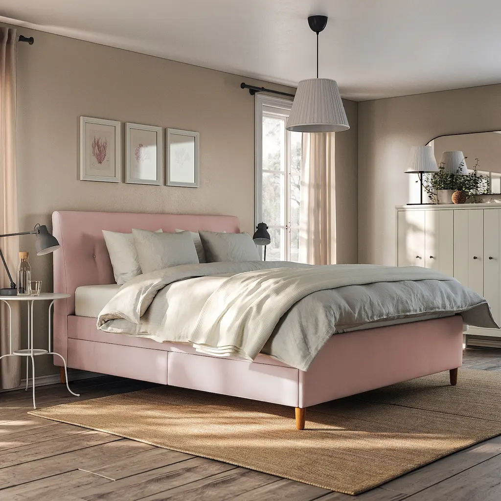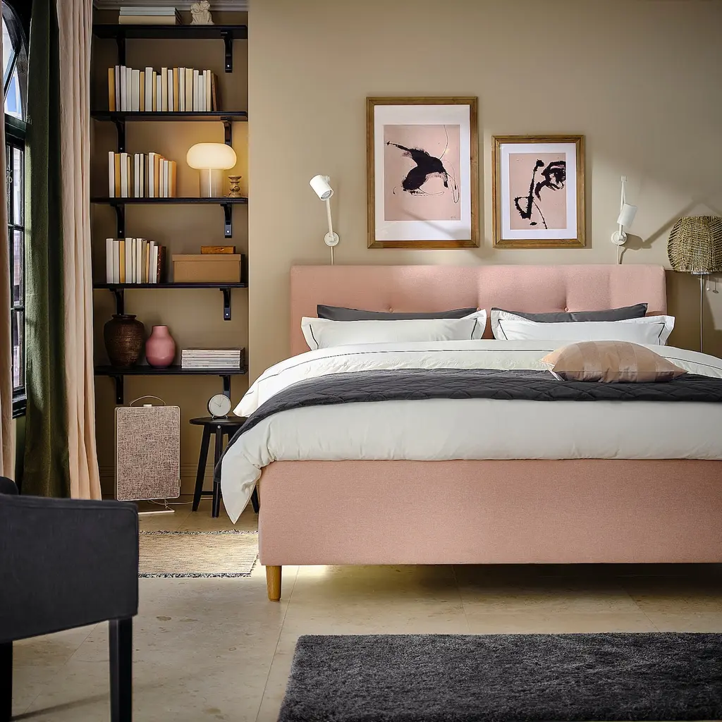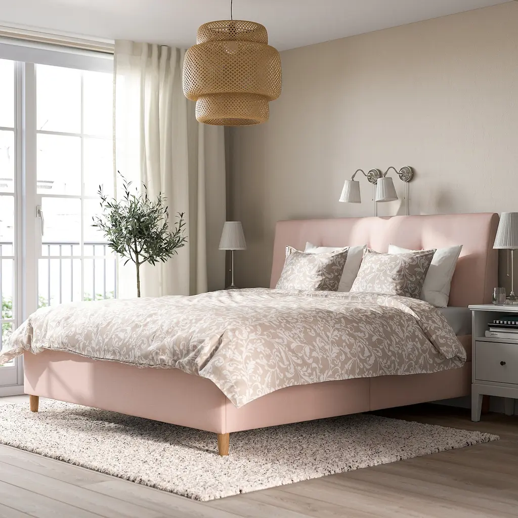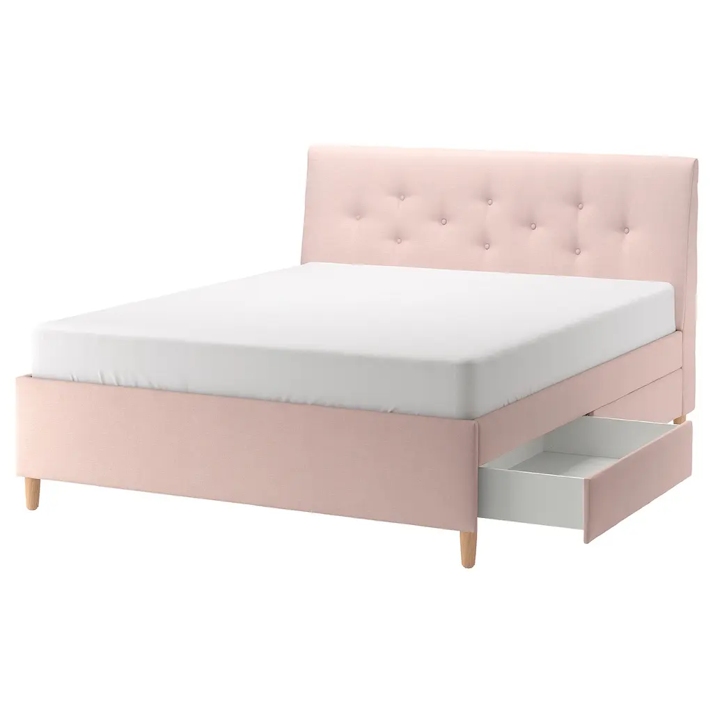 IDANÄS Upholstered storage bed - Gunnared pale pink King. IDANÄS upholstered storage bed has a thick, sloping headboard that provides comfortable support for your back and perfect for lazy mornings or long evenings when reading a newspaper or a book in bed.