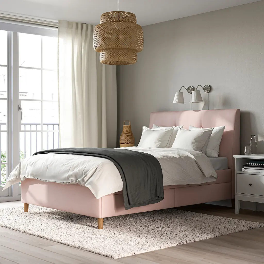 IDANÄS Upholstered storage bed - Gunnared pale pink Full. IDANÄS upholstered storage bed has a thick, sloping headboard that provides comfortable support for your back and perfect for lazy mornings or long evenings when reading a newspaper or a book in bed.
