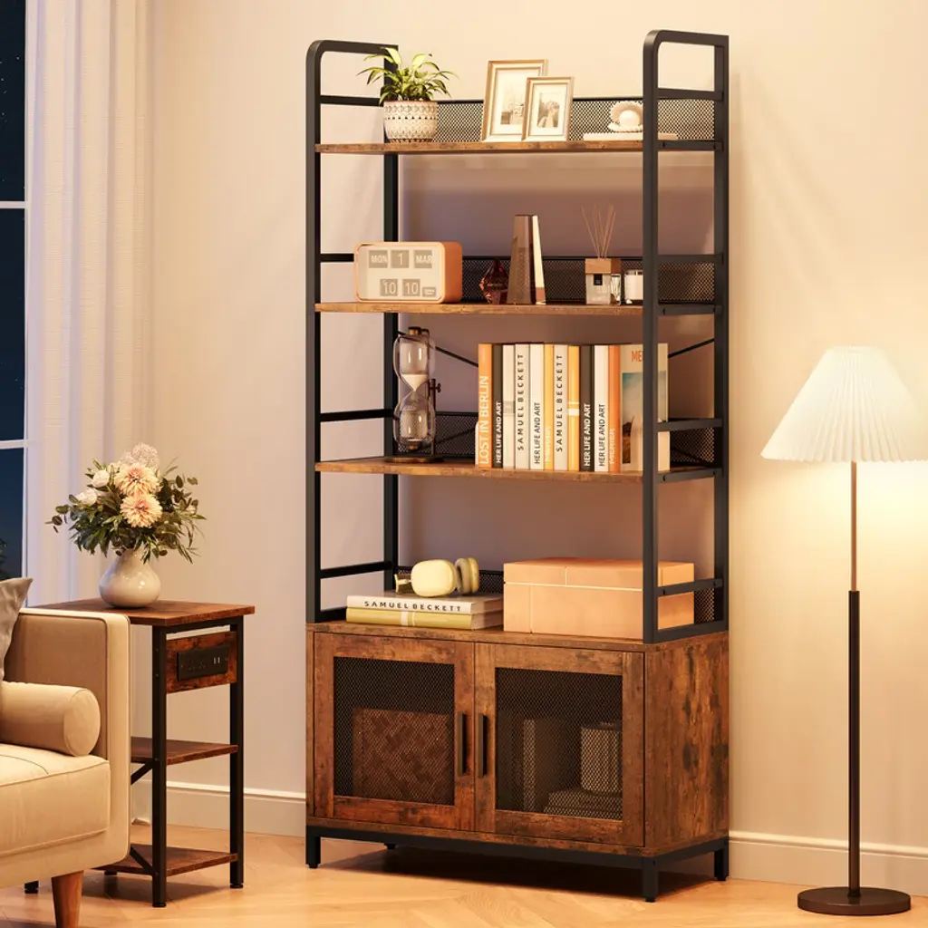 Industrial Bookshelf With Doors, 70.87" Tall 4-tier Bookcase, Open Storage Shelf & Cabinet For Bedroom Living Room Home Office, Farmhouse Brown