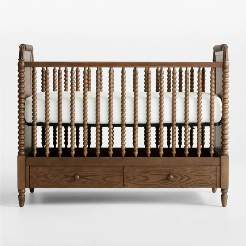 Our Jenny Lind heirloom storage crib is a timeless piece in any nursery. And this deep brown ash finish makes it even more elegant and earthy. The iconic collection, with its intricate wood turnings, has been made in the same location with the same classic design for more than 20 yearsbut its modern sensibility means it hasn't aged a day. Each spindle is made from a single piece of wood, then hand-sanded to capture every gorgeous detail. The crib seamlessly grows with your little one thanks to the easy-to-assemble toddler rail, and has 2 roomy drawers for storage over the years. Fun fact: This forever classic is named for the 19th century opera singer Jenny Lind, who was the pop icon and influencer of her day.