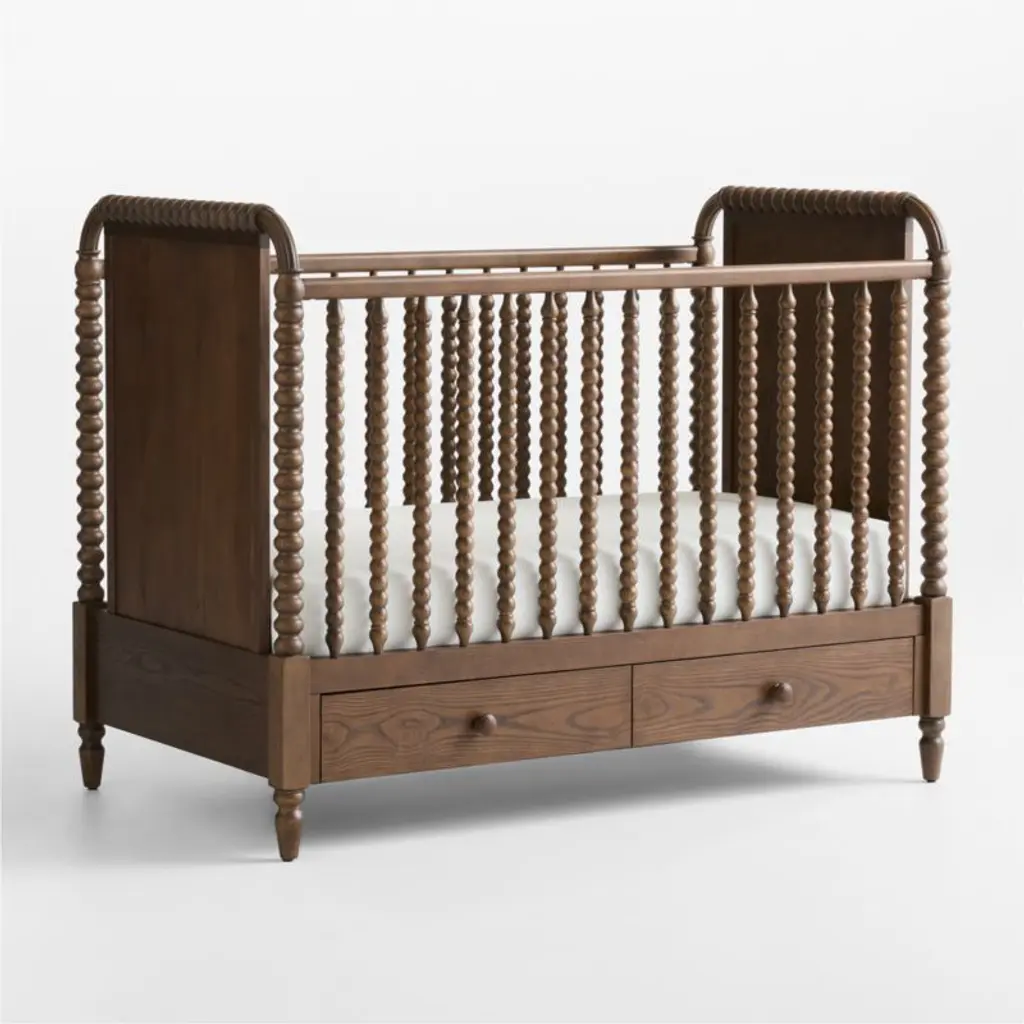 Our Jenny Lind heirloom storage crib is a timeless piece in any nursery. The iconic collection, with its intricate wood turnings, has been made in the same location with the same classic design for more than 20 yearsbut its modern sensibility means it hasn't aged a day. Each spindle is made from a single piece of wood, then hand-sanded to capture every gorgeous detail. The crib seamlessly grows with your little one thanks to the easy-to-assemble toddler rail, and has 2 roomy drawers for storage over the years. Fun fact: This forever classic is named for the 19th century opera singer Jenny Lind, who was the pop icon and influencer of her day.