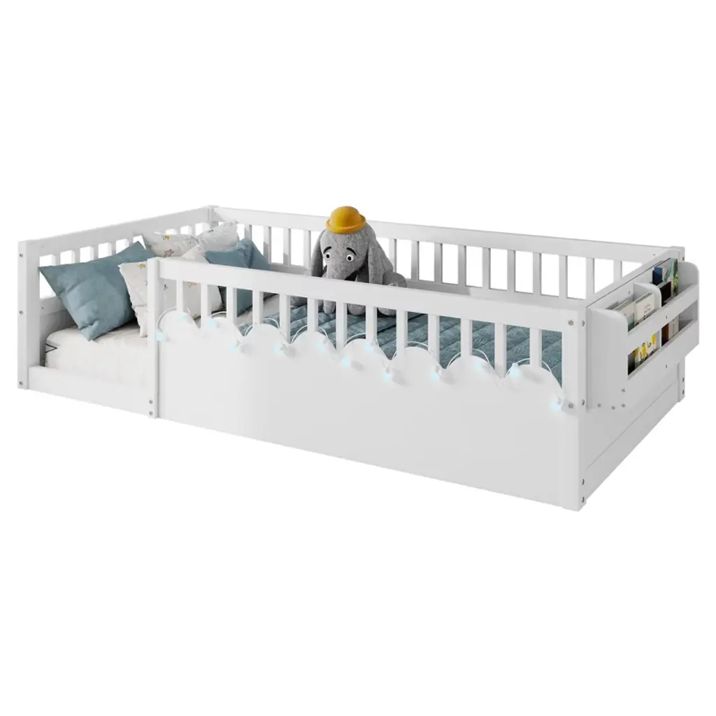 Jujabu Twin White Wood Floor Bed Frame With High Rails, Built-in Light & Storage Shelf For Kids