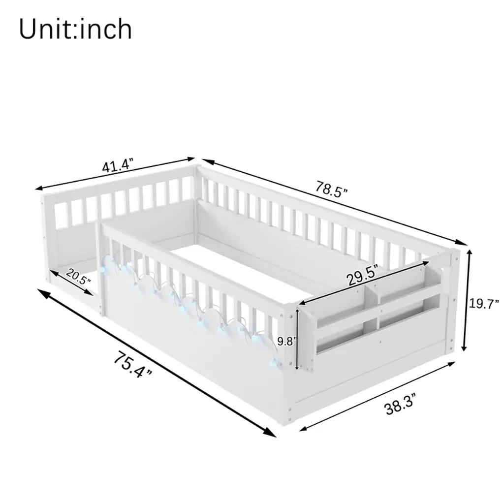 This twin wooden floor bed combines safety, functionality, and versatility, making it ideal for kids’ rooms. It features built-in LED lights (DIY-wrappable) to create a dreamy atmosphere, aiding safe nighttime movements, plus a storage shelf (installable on left or right) for easy access to books during reading time. Crafted from solid pine wood and MDF, it boasts a sturdy build with solid wood baffles and 2.7-inch gaps between rails to prevent pinching, while 19.7-inch high guardrails enhance safety for various mattress thicknesses. The low-to-the-ground design with an open door encourages kids to get in/out independently, fostering exploration and confidence. Without slats, it works as a bed or transforms into a play area, reading nook, or imaginative play zone—growing with your child’s needs.