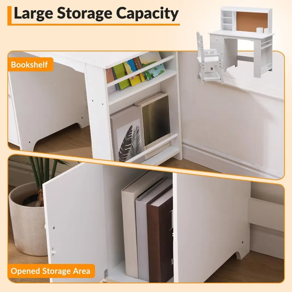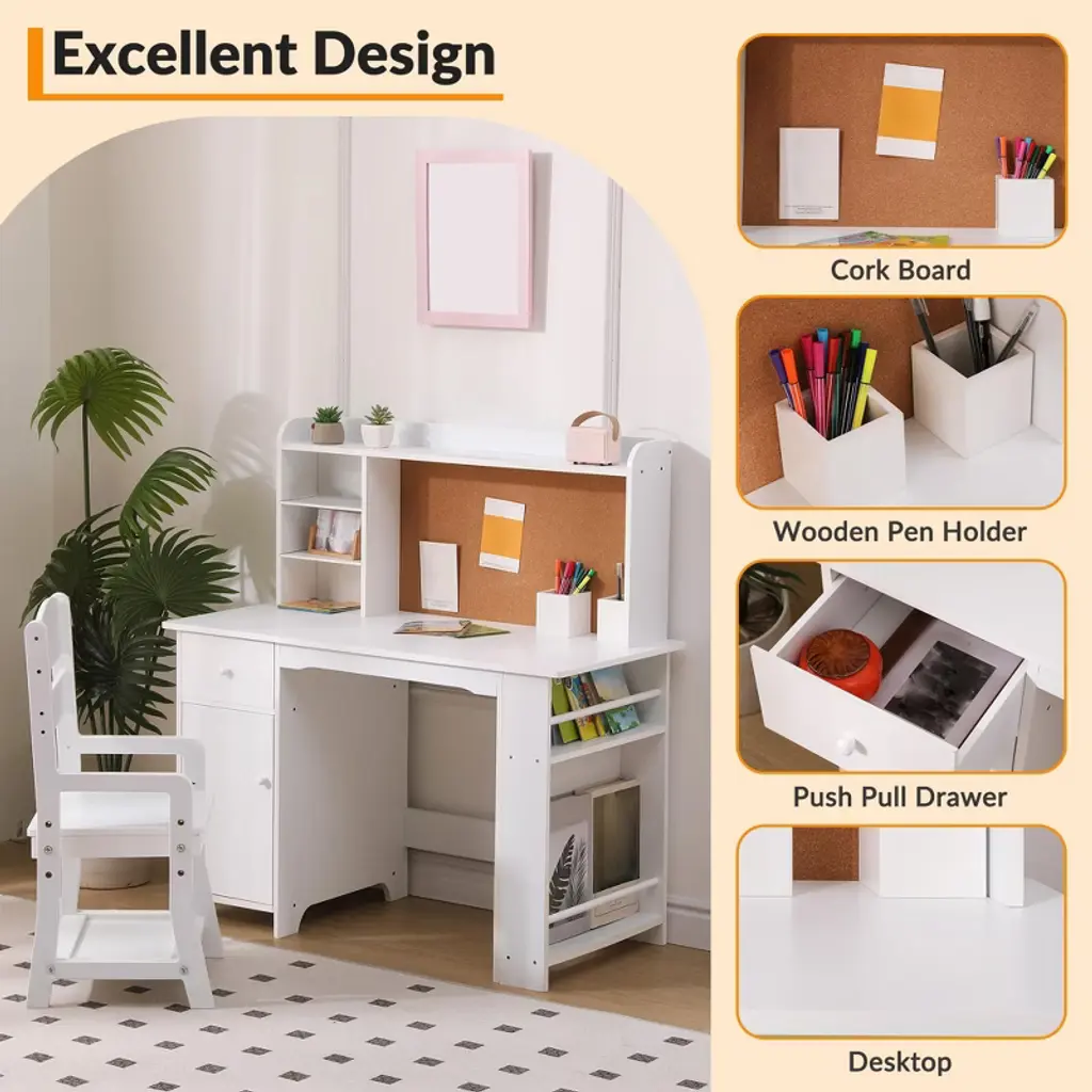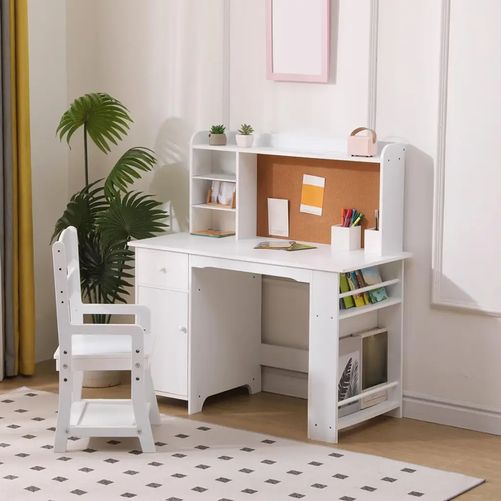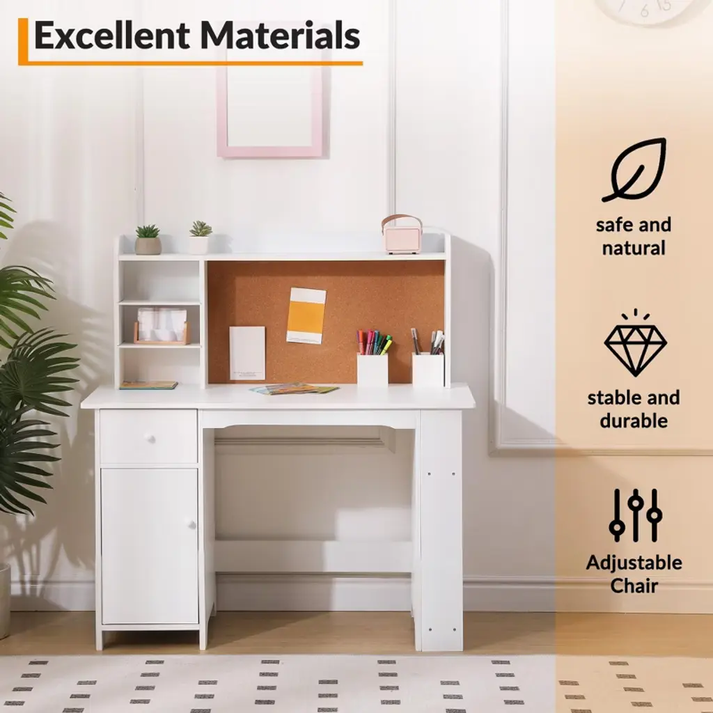 Kids Study Desk And Chair Sets With Hutch, Cork Bulletin Board, Drawer And Storage Cabinet, Wooden Children Study Table For Kids Bedroo, White