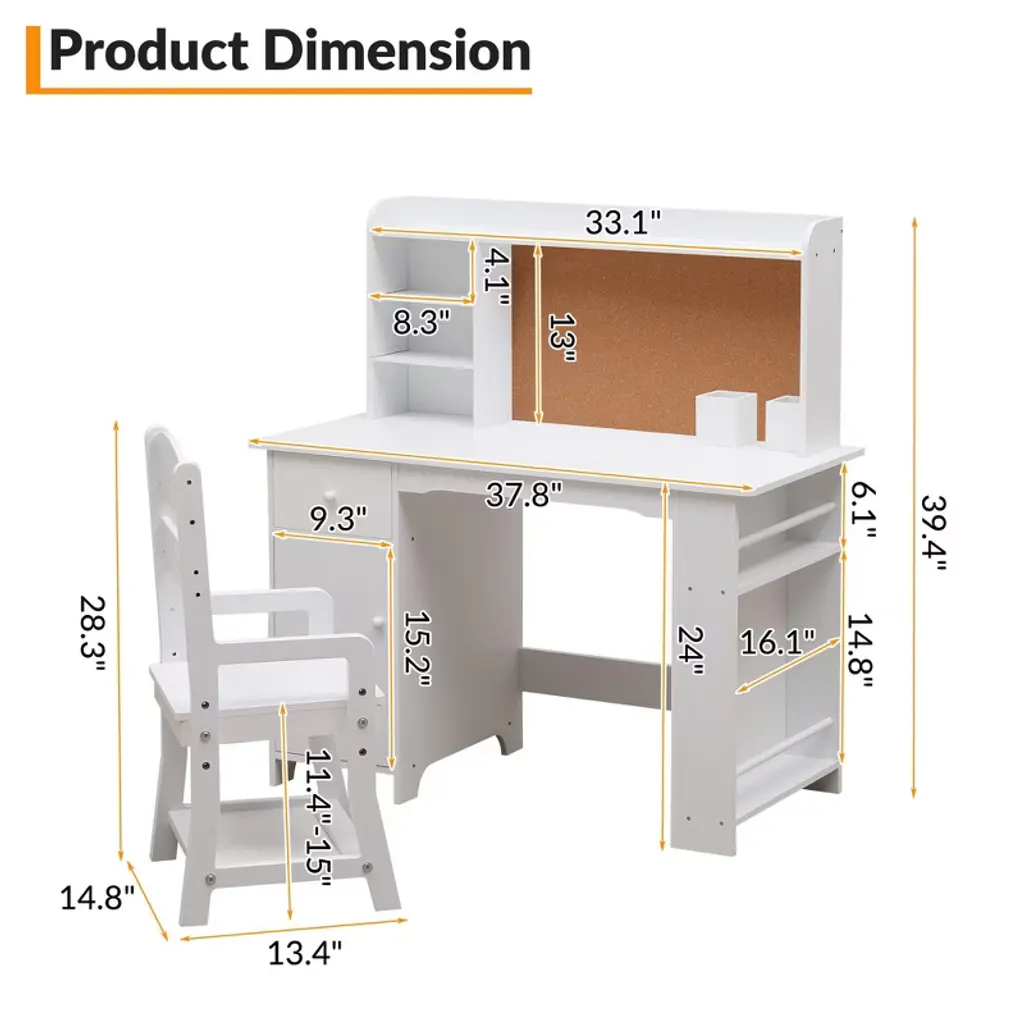 Elevate your child's learning experience with the stylish and functional study desk set, designed to inspire creativity and grow alongside them.Highlights at a Glance:Spacious hutch with a 3-tier shelf for organized storageBulletin board for personalizing their workspaceDurable MDF construction with safe, rounded edgesErgonomic chair with adjustable height for proper postureIdeal for kids ages 3-8, promoting healthy study habitsEasy assembly and low-maintenance cleaningElegant wooden finish enhances any decor styleSpecifications:Material: MDFTable Size: 40"H X 36"L X 18"W Chair Size: Special Features: Includes Cork Bulletin BoardStyle: ModernFriendly Note:Please follow the provided instructions for proper setup and ensure all parts are securely fastened.To keep your desk set looking its best, clean spills immediately with a damp cloth. Avoid using harsh chemicals or abrasive materials that may damage the surface.The study desk features rounded edges and non-toxic finishes, ensuring safety during use. However, adult supervision is recommended, especially with younger children.