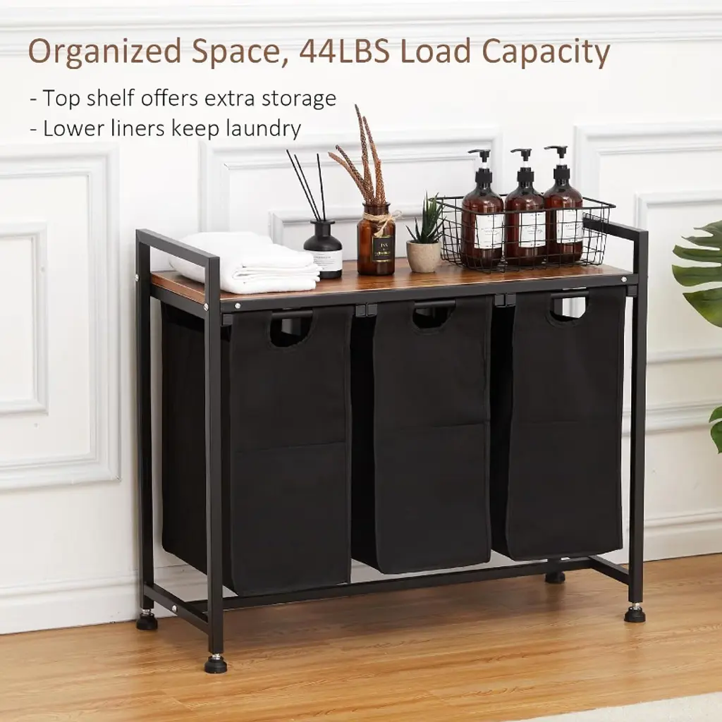 This laundry basket features a compartmentalized design for effortless sorting of light and dark garments, with each compartment supporting up to 30 pounds. The top shelf holds laundry detergent and other supplies, with a weight capacity of 44 pounds. The reinforced metal frame and Oxford fabric construction ensure sturdy durability, while adjustable feet accommodate uneven surfaces. Suitable for bathrooms, bedrooms, and multiple settings, it combines sorting, portable transport, and storage functions to help maintain a tidy and organized home.