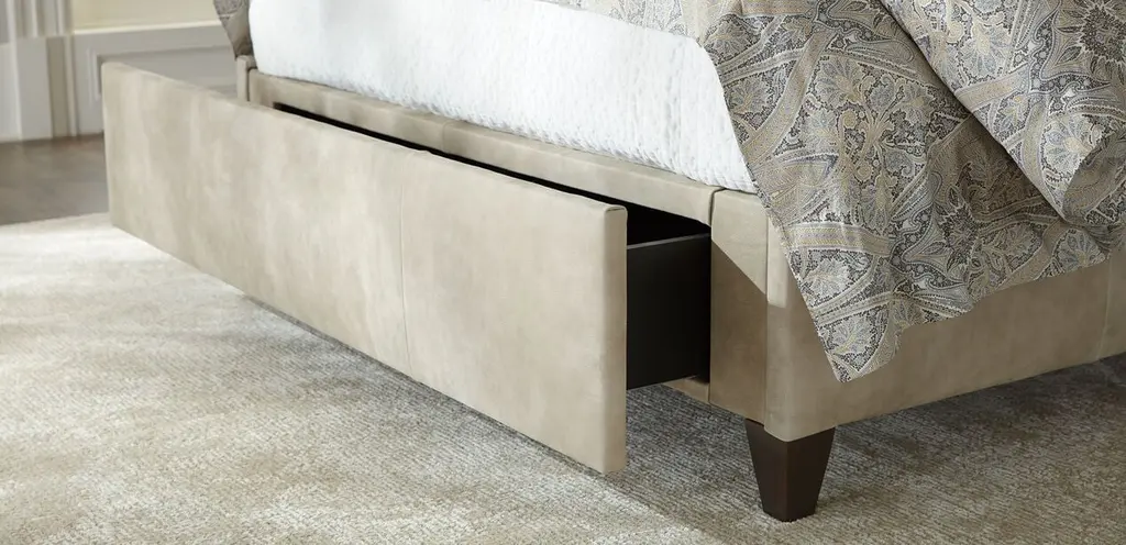 All eyes will be on Lianna's stunning, cut-corner headboard; only you will notice the discreet drawer in its base. Customize your leather storage bed in the Ethan Allen leather of your choice, and leave it smooth or add classic accoutrements, like diamond tufting and nailhead trim.