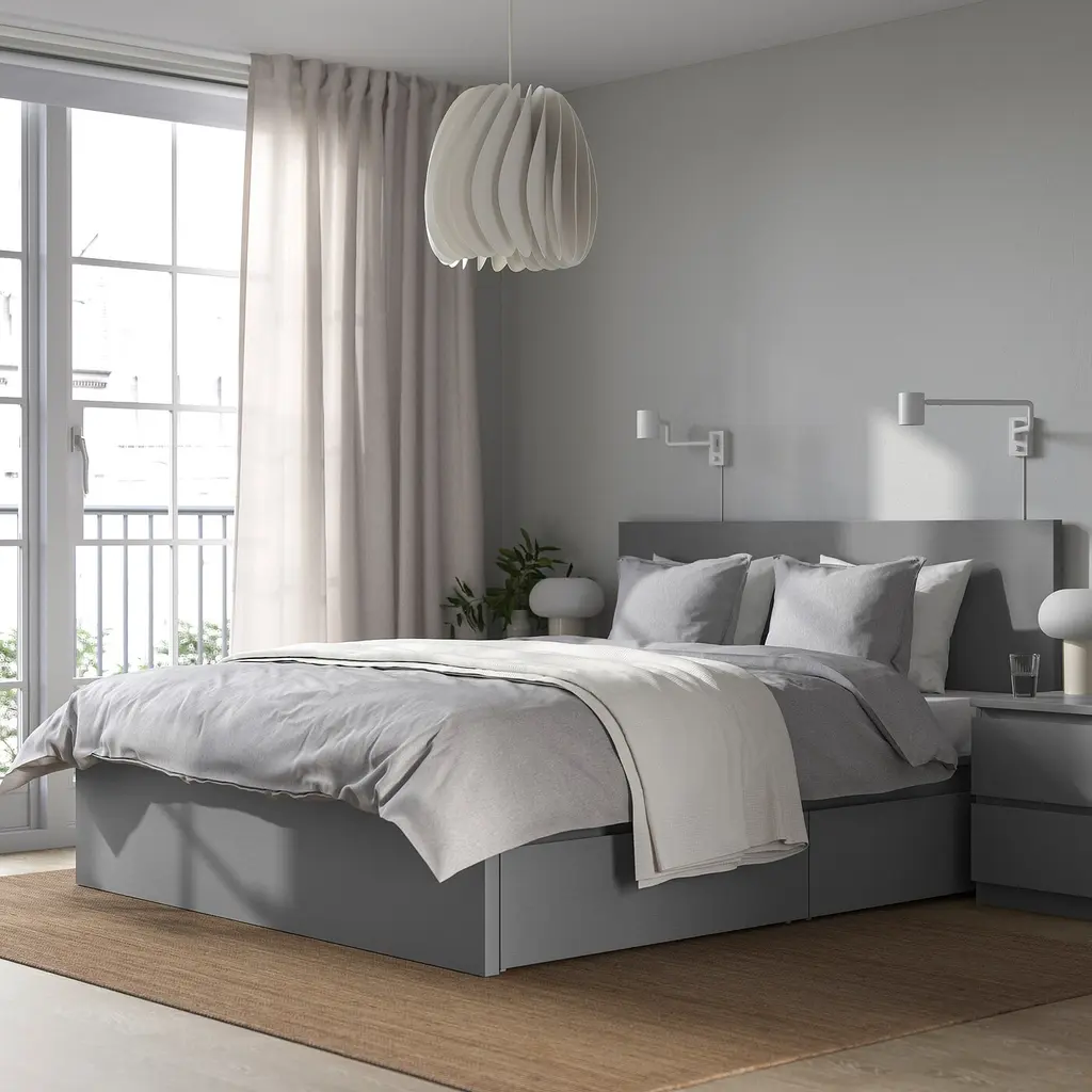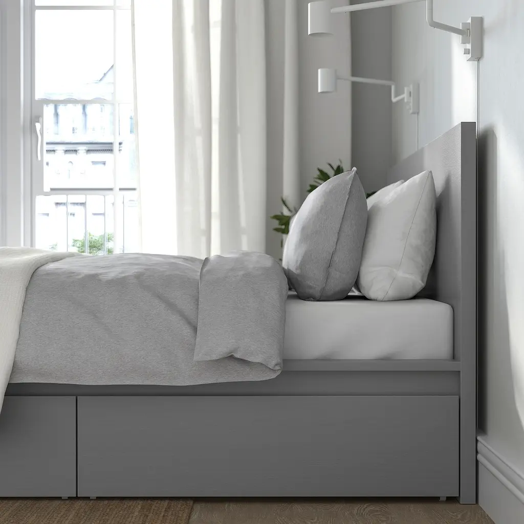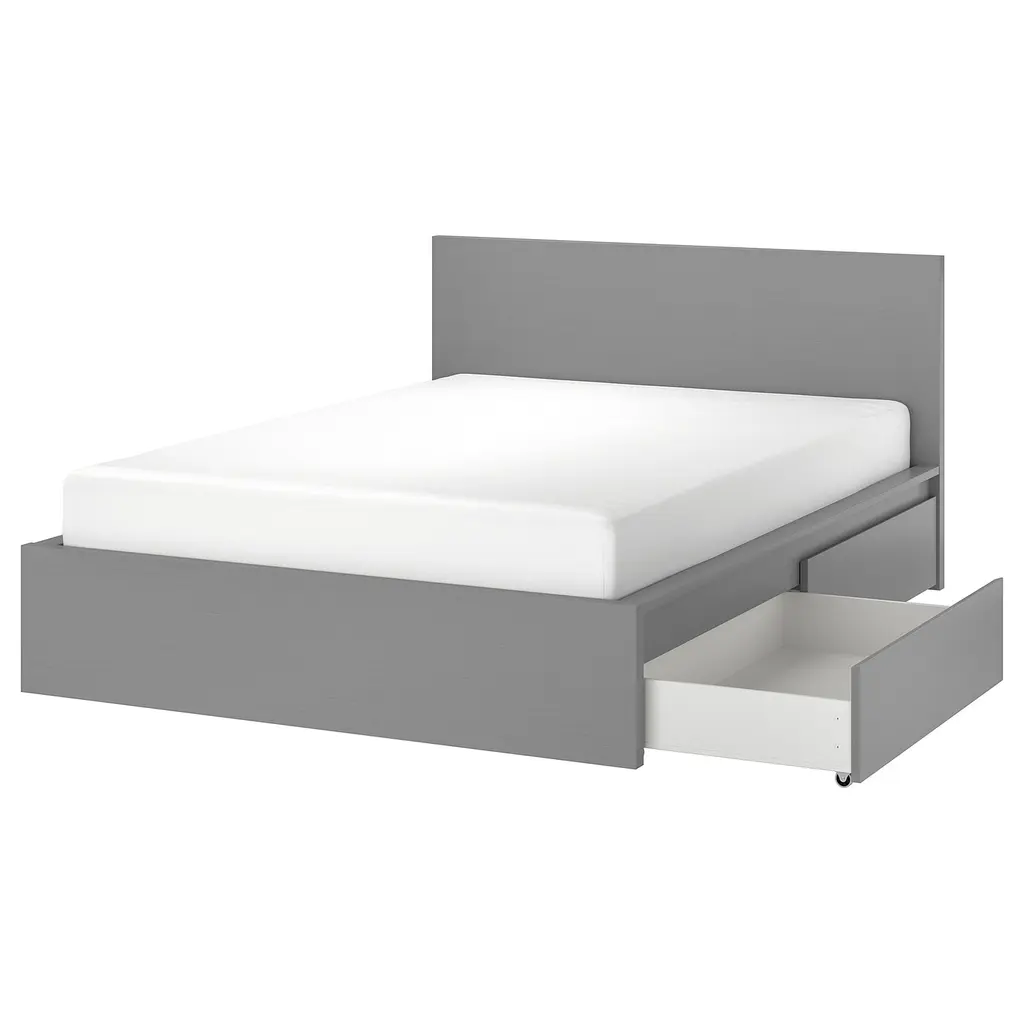 MALM High bed frame/2 storage boxes - gray stained King. The 2 large drawers on casters give you an extra storage space under the bed. Adjustable bed sides allow you to use mattresses of different thicknesses. Slatted bed base and mattress sold separately.