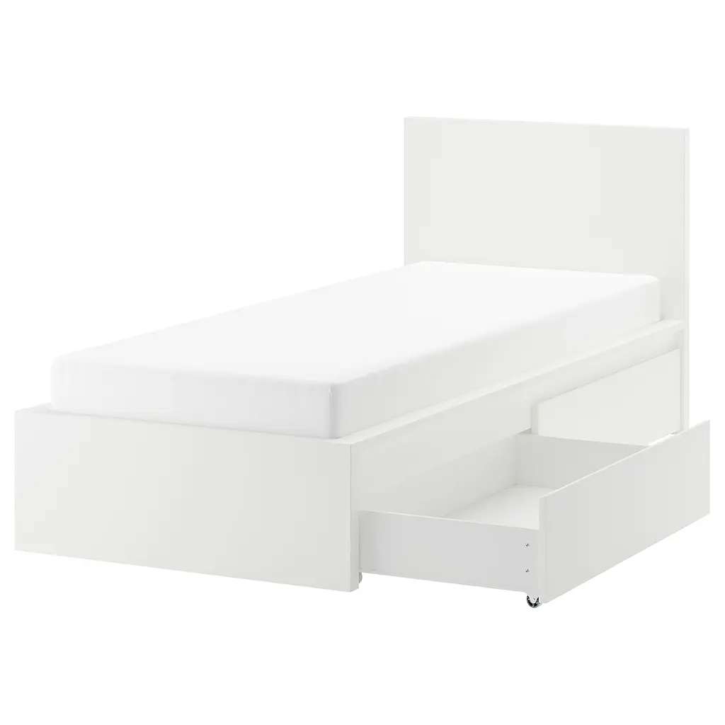 MALM High bed frame/2 storage boxes - white Twin. Ample storage space is hidden neatly under the bed in 2 large drawers. Perfect for storing duvets, pillows and bed linen. The storage boxes are easy to roll out and in thanks to the castors on the base. Slatted bed base and mattress sold separately.