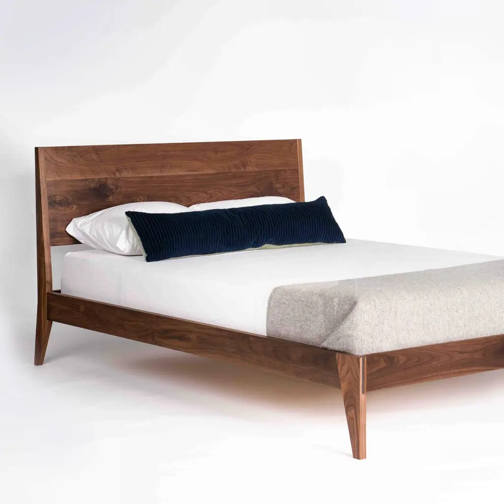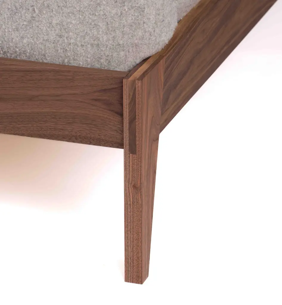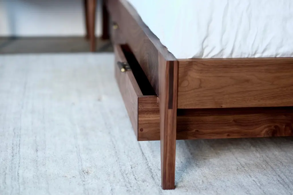Featuring strong lines, exposed joinery and an enjoyably slanted headboard.This bed exhibits clean, coherent lines with angles reminiscent of the mid century era, but brought into a contemporary and modern design. The details include exposed angled bridle joints and feet that are subtle, yet instantly eye-catching. The entire bed is constructed with mortise and tenon joinery (super strong) and is finished with a hand rubbed oil/wax to keep a close to wood feel but also protect from a lifetime of use.The drawers, if storage option is added, suspend from the bed and do not go all the way to the floor giving a much lighter and airy feel than traditional storage beds, while providing the same storage capacity.Our goal with this bed has been, first and foremost, to construct a piece of furniture that will last well over 50 years without issue. Quality of material and construction is our focus. I hope you like the design and find the proportions pleasing, but we strive primarily to surpass your expectations in regard to quality. A key advantage of purchasing from a smaller scale shop is that we can justify losing our minds on details such as grain orientation and joinery reinforcement. Please enjoy for many, many years to come.If storage option is added, the drawers suspend from the bed and do not go all the way to the floor giving a much lighter and airy feel than traditional storage beds, while providing the same storage capacity. The pulls for the drawers are hide leather wrapped around a brass rod and the drawer joinery is also pinned with brass for a subtle, but interesting contrast. Other drawer pull options are also available.
