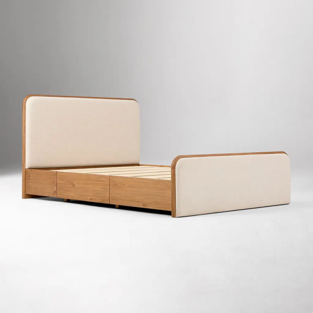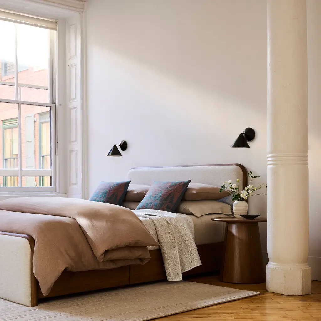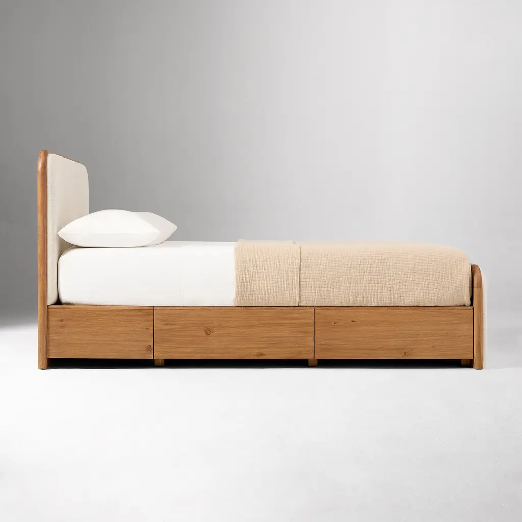 Our best-selling Miles Bed, now with functional storage. Upholstered headboard and footboard with modern wood trim. Made from kiln-dried, sustainably sourced wood. Crafted in a Fair Trade Certified™ facility.