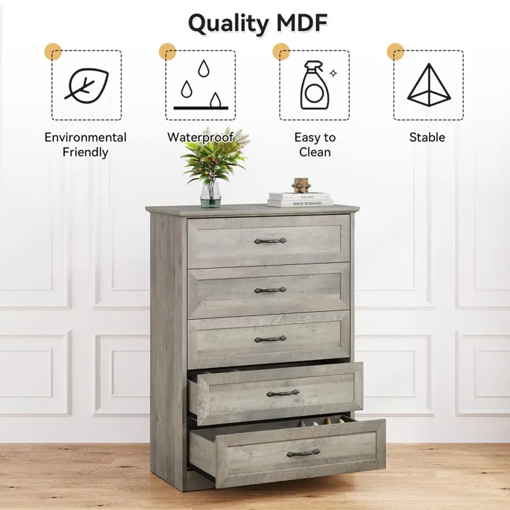 【Spacious Storage Space】 Measuring 31.5" D X 15.7" W X 43.9" H.This grey dresser features 5 spacious drawers, providing versatile storage for organizing various items such as shirts, underwear, socks, hats, ties, baby essentials, and children's toys. The ample drawer space ensures items are kept sorted and easily accessible, while the spacious top surface is ideal for lamps, decorations, or cherished photos. 【Multifunctional Dresser】This grey dresser for bedroom offers various placement options for your room. Beyond serving as a storage cabinet in the bedroom, it can be used as an entryway dresser for daily items and overflow, or even as a TV stand in the living room for odds and ends. With its classic charm and natural grey finish, this chest of drawers complements various rooms and settings, adding a timeless touch of elegance. 【Quality Craftsmanship】 This modern dresser is made from high-quality MDF wood with sturdy metal slides. It features a thick, scratch-resistant, waterproof top that’s easy to clean. The reinforced bottom offers excellent stability and strong support for daily use, while the smooth, quiet drawers glide effortlessly on high-quality metal rails, ensuring they stay steady and make no noise during daily use. 【Enhanced Safety Features】 This grey 5 drawers dresser includes an anti-tipping accessory for added security. Perfect for households with kids or pets, it keeps the dresser stable and prevents accidental tipping. You can confidently store your items without worrying about safety, ensuring peace of mind and a secure, stylish home. 【Chic and Elegant】This wooden tall dresser blends sleek, minimalist lines with the natural beauty of grey wood grain for a modern, timeless look. Vintage-inspired handles add classic charm, while the curved base creates an elegant outline. Ideal for any room, from the bedroom to the living room, it offers ample storage and sophisticated style that complements your home décor. 【EASY ASSEMBLY】This storage dresser is designed with ease of installation in mind. It includes detailed instructions, numbered parts, and pre-drilled holes for accurate and quick assembly, so you can spend less time putting it together. If you have any questions before or after your purchase, feel free to contact us via email. We guarantee a response within 24 hours to assist with any concerns.