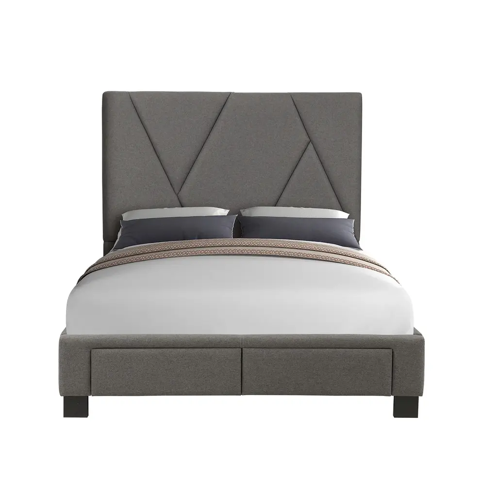 The Modern storage bed takes the place of both a metal frame and a box spring/foundation. Handsomely styled, it’s fully upholstered, so no need to cover it up with a bed skirt—and no hard edges to worry about. Quick and easy to assemble, this durable foundation has drop-in rails, a Velcro-attached slat roll, and a clip-in center support with legs. Two drawers in the footboard supply extra storage. Pair it with a Modern upholstered headboard for a sophisticated look.