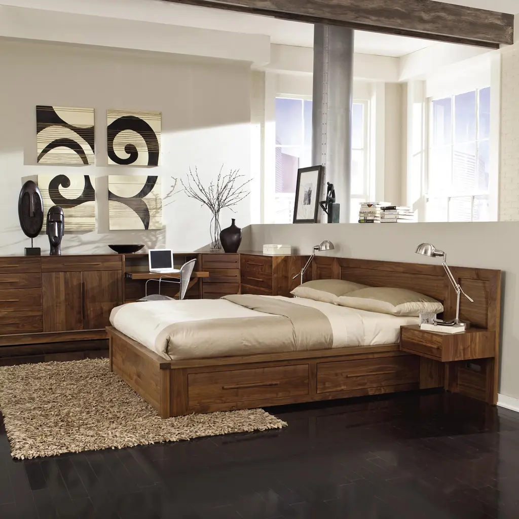 The Moduluxe Storage Bed with Panel Headboard is a sectional piece of furniture from the highly configurable Moduluxe bedroom collection. Space, style and function are the three main themes expressed in this bed. This modern bed features 4, eight inch deep, sub-mounted drawers, providing plenty of inconspicuous storage and allowing for a roomier living environment. The Moduluxe Bedroom furniture pieces are made to order in your choice of solid cherry or American black walnut hardwood. Our modern Moduluxe Bedroom Furniture Collection is handmade in Vermont using eco-friendly, sustainably harvested natural woods.Base price represents queen size bed in natural cherryShown in queen size bed in natural walnutMatching furniture available in our Moduluxe Furniture CollectionNatural variations in solid wood and hand applied finishes make each piece unique. Slight grain and finish irregularities tell you that the furniture has been crafted from solid wood and are considered hallmarks of quality