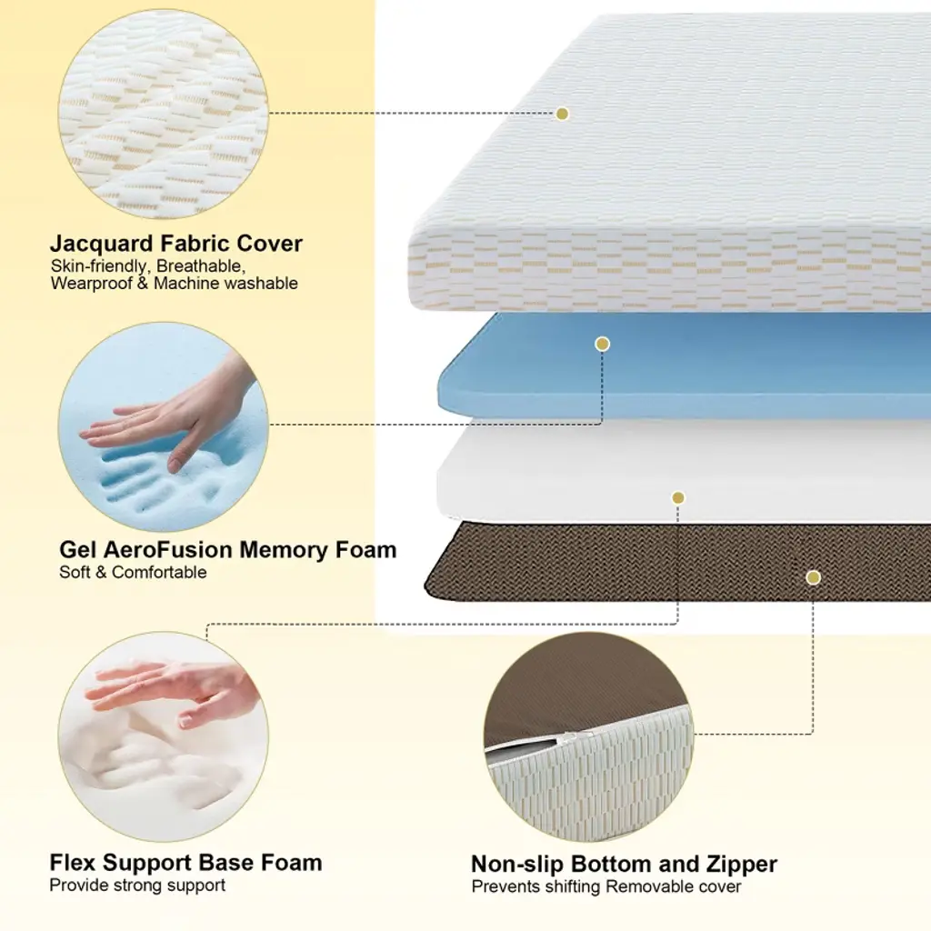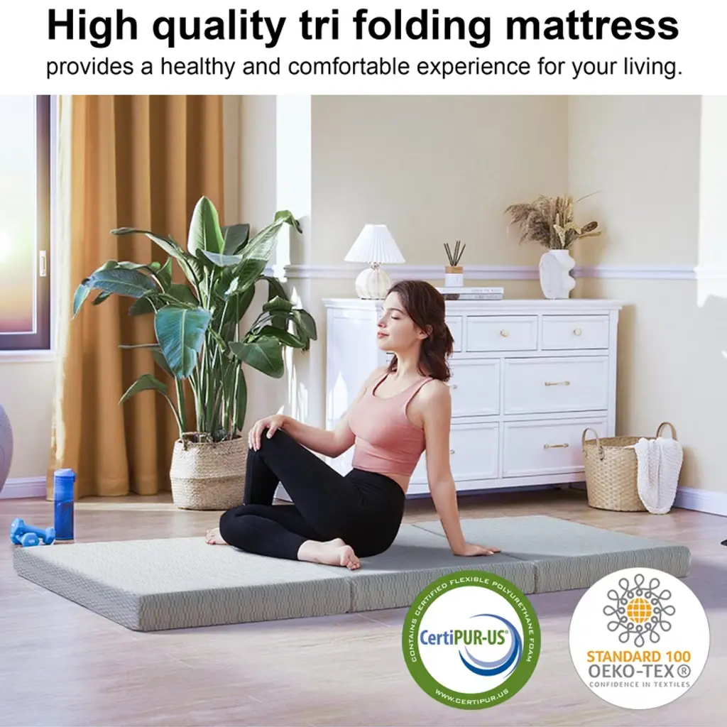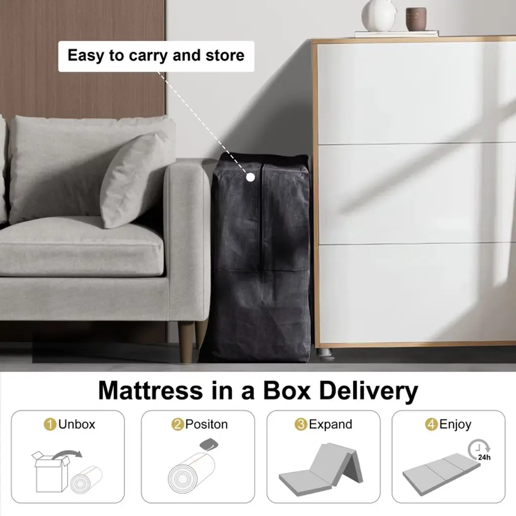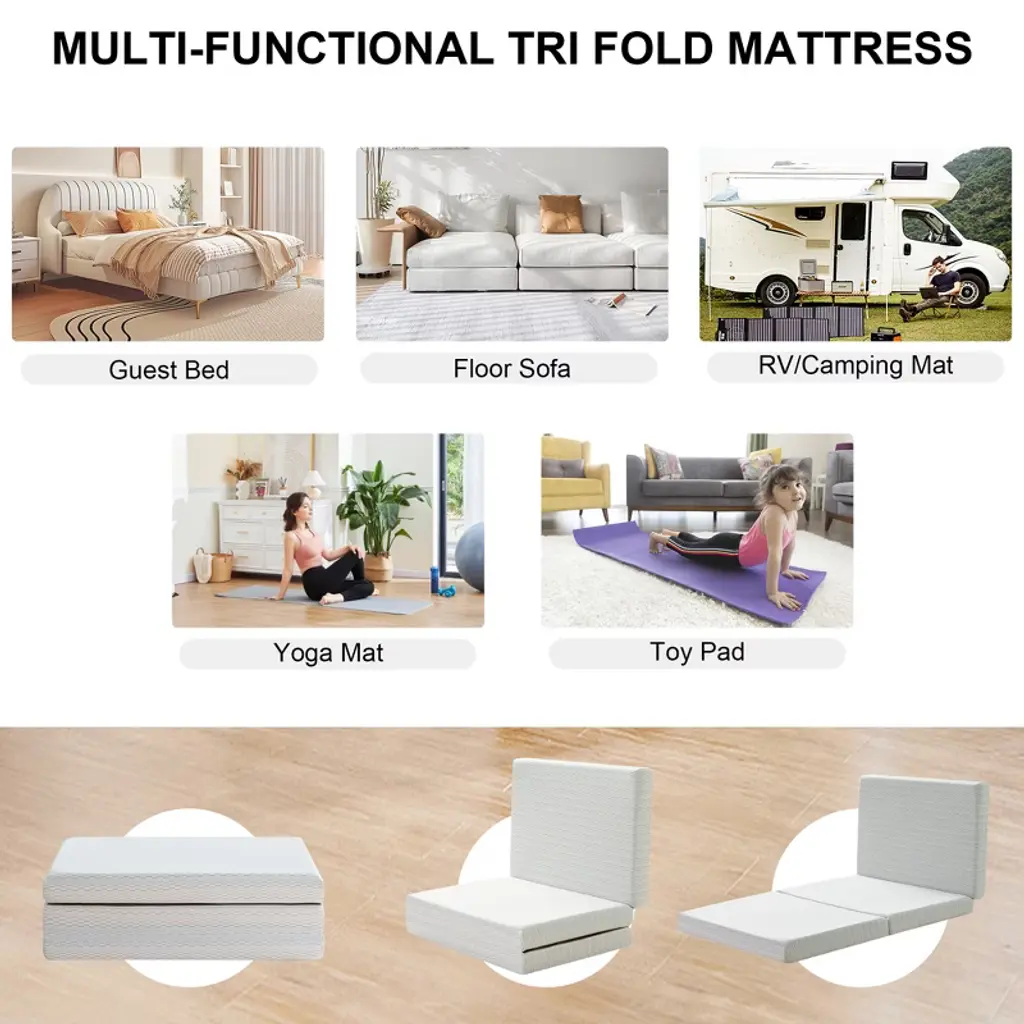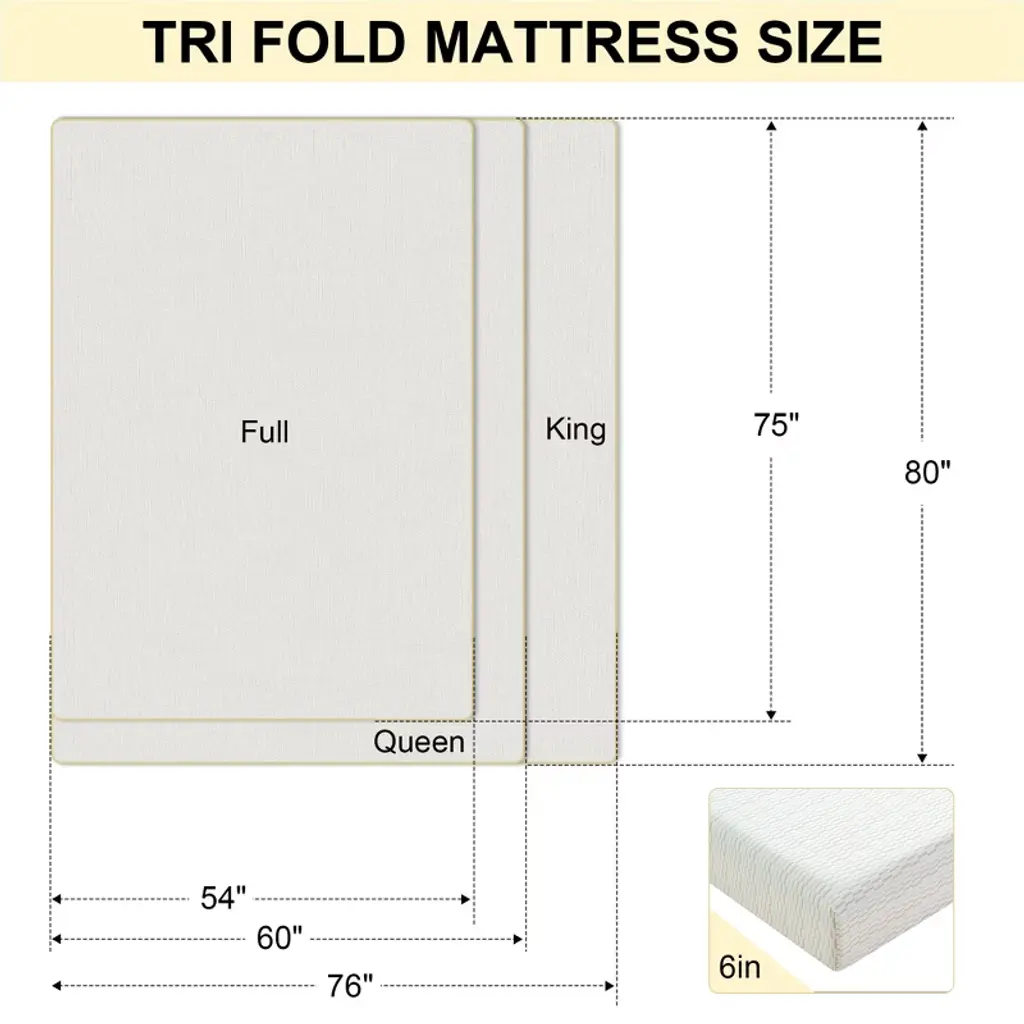 6 Inch Memory Foam Queen Trifold Mattress experience cloud-like softness and firm support with our high-density memory foam tri folding mattress. The gel-infused memory foam contours to your body¡¯s shape, alleviating pressure points for a deeper, more restful sleep. The resilient base foam provides long-lasting durability and prevents sagging, ensuring reliable support for years. This tri-fold mattress effortlessly folds into a compact size with a sturdy carry handle, making it perfect for small spaces, dorm rooms, RVs, or travel. It¡¯s an ideal solution for an extra guest bed, a camping mattress, or a portable floor lounger. Simply unfold for instant comfort and easily fold away when not in use! Whether you need a guest bed, a yoga mat, a camping pad, or a temporary sofa, our tri folding mattress adapts to your needs. It's perfect for overnight visitors, outdoor adventures, movie nights, or reading sessions, offering the flexibility to serve multiple purposes. The removable, washable cover is crafted from breathable fabric that promotes airflow to keep you cool throughout the night. The anti-slip bottom ensures stability on various surfaces, while the hidden zipper offers a sleek, secure fit. Maintenance is a breeze¡ªjust toss the cover in the wash! Packed for convenience, this mattress expands to its full size within 24-48 hours and reaches optimal comfort in 72 hours. The high-resilience foam retains its shape, guaranteeing years of supportive sleep. Its compact design ensures easy storage, while the non-slip bottom keeps it firmly in place.