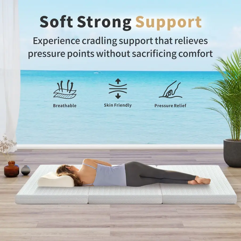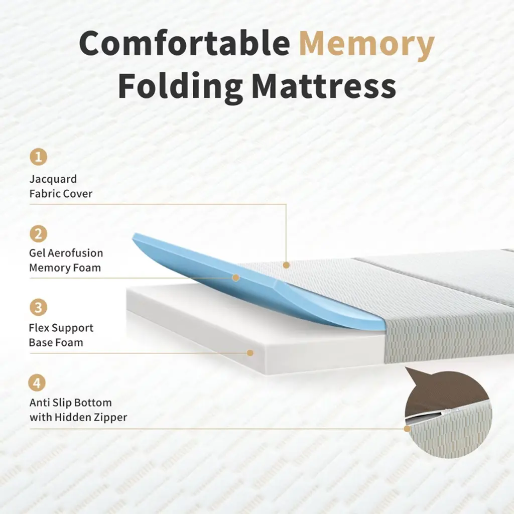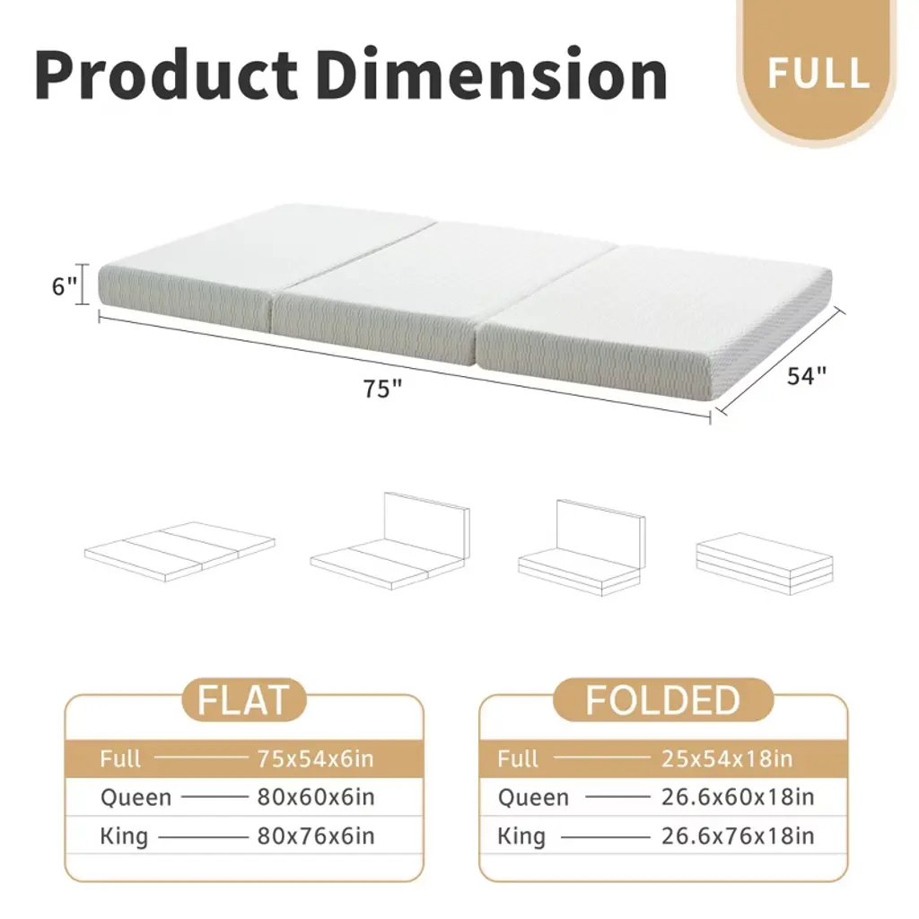 Ultimate Comfort & Support with CertiPUR-US Foam: Experience superior sleep with our CertiPUR-US certified AeroFusion Memory Foam. This MUUEGM mattress conforms to your body, relieving back pain and pressure points for a healthier spine. The gel infusion ensures a constant cool temperature, while the high-density Base Foam provides strong, durable support, preventing sagging or deformation even with prolonged use. Multi-Functional & Versatile Design: This tri-fold mattress is your perfect solution for various needs. Easily unfold it to serve as a temporary guest bed, or use it as a yoga mat, a kids' play pad, a floor sofa, or a dormitory mattress. Its portable design makes it an ideal choice for RV trips, camping, and travel, ensuring you always have a comfortable place to rest. The non-slip, waterproof bottom adds extra security and outdoor functionality. Healthy & Safe with High Standards: Unlike ordinary memory foam, our mattress foam is CertiPUR-US certified, ensuring it's more eco-friendly, soft, and durable. The high standards guarantee your health and safety. The jacquard fabric cover is also certified by an international textile organization, featuring a ventilated, skin-friendly design that's even safe for infants to use. Easy to Store & Maintain: When not in use, simply fold the mattress and place it in the included storage bag to save valuable space. The durable jacquard fabric cover is moisture-proof and dust-proof. With a smooth, hidden zipper, the cover can be easily removed for machine washing, making maintenance a breeze. Buy With Confidence: Our MUUEGM tri-fold mattresses are manufactured with a zero-contact process to ensure the inner foam core remains pristine. We use advanced compression technology to guarantee no damage during shipping. Simply unbox your mattress and allow it to fully expand before use to enjoy a restful night's sleep.