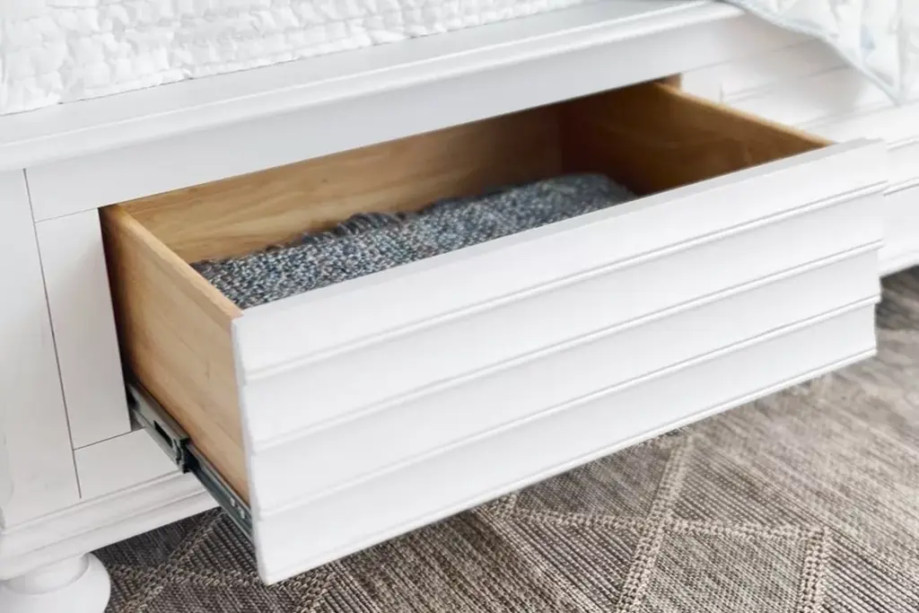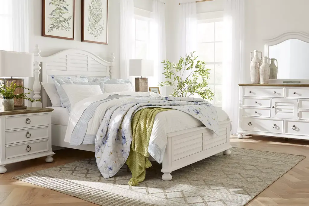 Create a charming and sophisticated atmosphere in your room with our Nantucket storage bed. With a multi-step, white and driftwood two-tone finish, louvered detailing and bun feet, this piece boasts style and charm. Available in king and queen sizes, this bed will make a memorable statement in any bedroom. The storage footboard offers two spacious drawers with ball-bearing side guides to stow away clothing and linens. Use the information below along with the height of your mattress to select the right foundation for your new bed. Our Havertys sleep experts can also help you select the perfect mattress for your sleep needs.