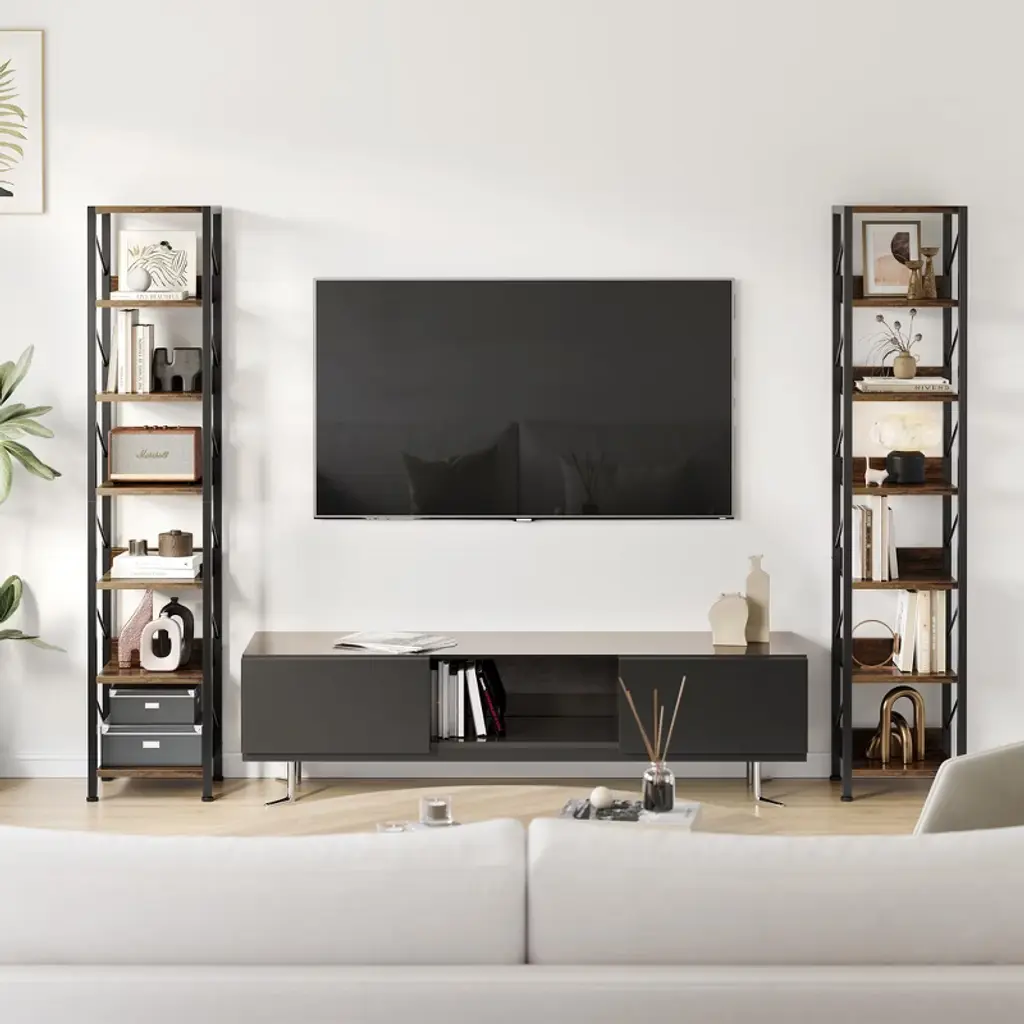 Sturdy Material & Reliable Construction: By utilizing high-density MDF board and a well-structured metal frame, this narrow bookshelf is equipped to withstand the rigors of long-term use. The addition of specially crafted extra-shaped sidebars and anti-tipping straps enhances the overall security and stability of the bookcase, providing peace of mind for users and preventing accidents or damage caused by shifting or tipping. With a weight capacity of 30 pounds per shelf, the bookshelf offers ample storage and display space for various items while maintaining structural integrity and safety. Industrial Design: The narrow bookshelf blends an industrial aesthetic with a compact form and versatile rustic color scheme, creating a stylish and space-saving storage solution for displaying your favorite books and decorations. With its slim frame and easy-to-match color palette, this bookshelf adds a touch of sophistication to any room while maximizing functionality in a minimal footprint. Ideal for those who value practicality and visual appeal, this small bookcase is designed to harmonize with a variety of furniture pieces, offering a versatile and chic addition to your living space. Efficient Storage Solution for Compact Areas: The slender bookshelf is designed to maximize space utilization in small living spaces, measuring a modest 66”x 12”x 12” (H x L x W) with 12.99” of space between each tier. Featuring six tiers of storage shelving, this bookshelf provides ample room for organizing and showcasing a variety of items, including books, family photos, decor pieces, and more. Its compact dimensions make it ideal for optimizing limited space, allowing you to make the most of narrow or corner areas in your home while meeting your daily storage needs with ease. Multi-Functional:: This rustic bookcase can be used as a bookshelf in the study room, a corner shelf in the bedroom, an open display rack of collections in your living room, or a storage shelf of spices in the kitchen, it also fits perfectly into the home office, bathroom, balcony and so on. Hassle-Free Assemble: The corner bookshelf comes with step-by-step illustrated instructions and necessary accessories to help you finish the whole installation effortlessly, the hardware and parts are marked with numbers or letters on each piece for your needs, besides, the surface is smooth and waterproof, just clean it with a damp cloth.