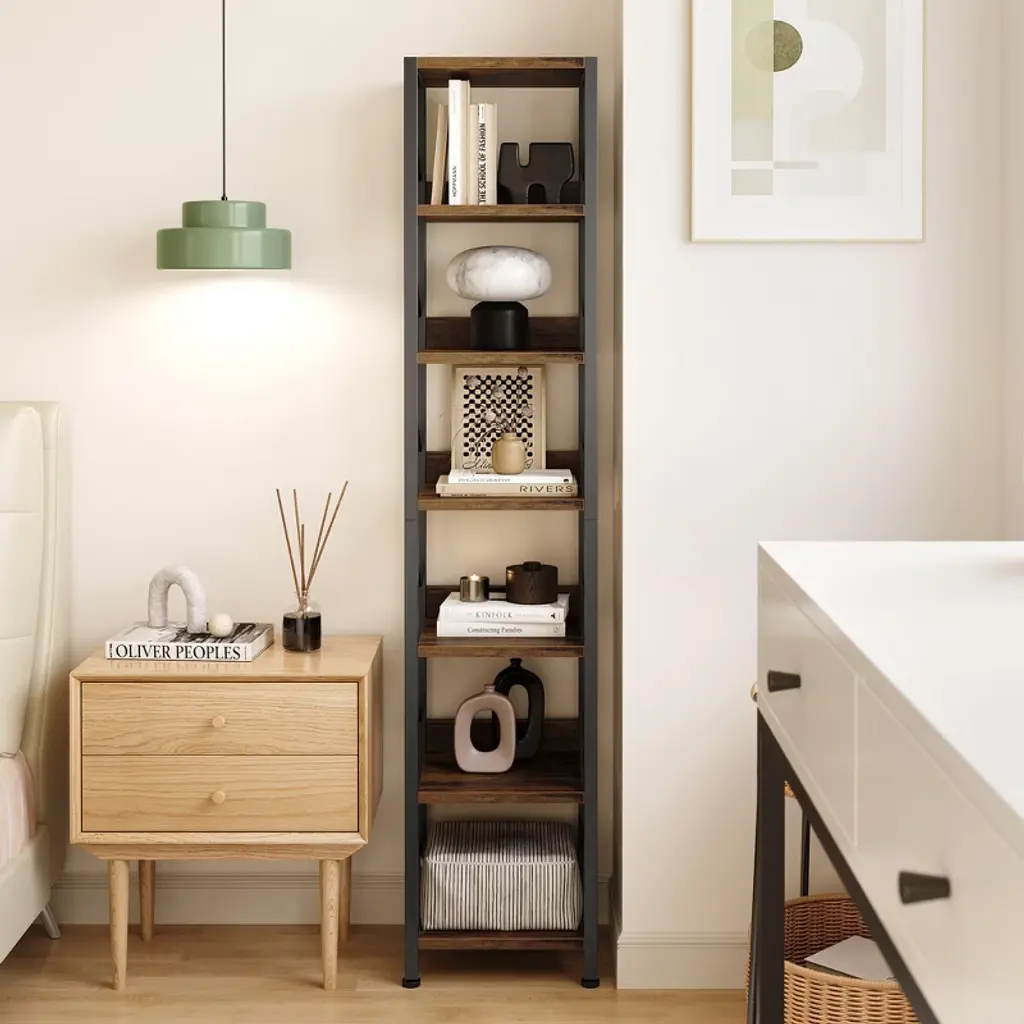 Narrow 6-tier Tall Bookshelf – Rustic Metal Frame Skinny Storage Rack For Small Spaces – Freestanding Industrial Display Stand For Bedroom,brown