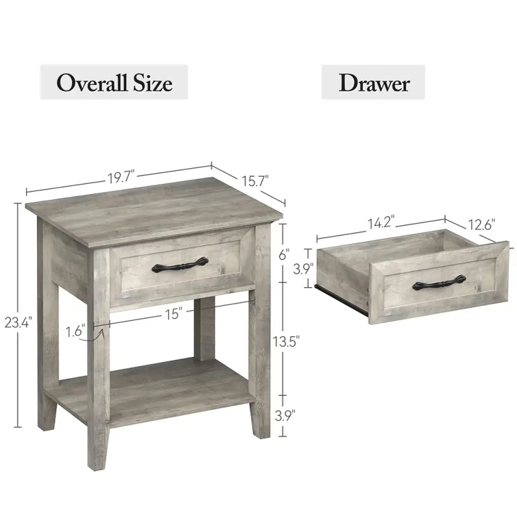 Stylish Design: A simple and modern style makes it fit any decor. You can place this bedside table next to your bed, it can be used to match your bed, and it can also act as a dresser, a warm lamp, some books, etc. this bedside table can add a wonderful addition to your bedroom Feel.Multipurpose: Place the side table next to the sofa. The drawer of the coffee table can be used to store small items such as remote controls and mobile phone chargers. Coffee and desserts, etc. can be placed on the table, enjoy life.Easy Assembly: Install manual and tools are included in our end table's packing box. Follow the instruction and you can put it together in a few steps. Drawer dimension 14.2 inches (D) x 12.6 inches (W) x 3.9 inches (H); Overall dimension 19.7 inches (D) x 15.7 inches (W) x 23.4 inches (H).High Quality: Our drawers come with guide rails, which are easy to pull and push. Durable wood board, its sturdy construction ensures durability against wear and tear over time.Spacious Storage: The nightstand provides ample storage space with 1 drawer and a storage shelf. The drawer is perfect for keeping items like remote controls, skincare products, phones, and glasses, while the lower shelf can hold storage boxes, magazines, and more.Be Careful: Under different lights, the color of the nightstand will be different.