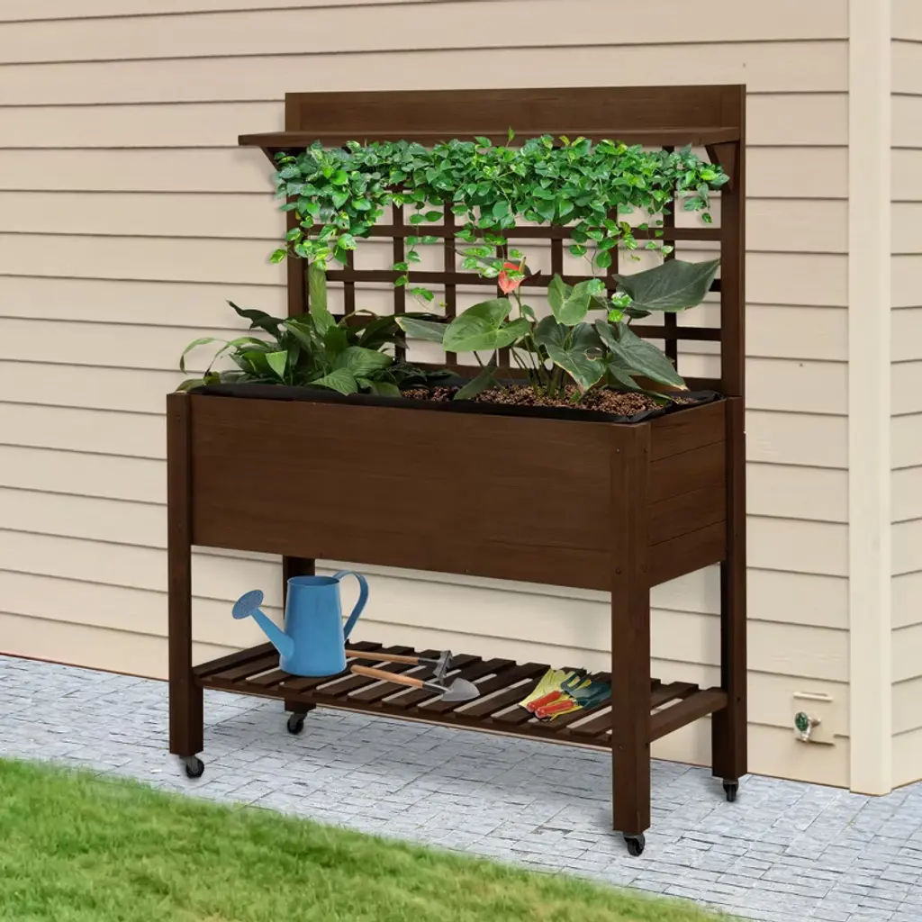 Outsunny Raised Garden Bed, Elevated Planter Box With Legs & Wheels For Outdoor Indoor, Trellis For Climbing Plants, 2 Storage Shelves, Brown