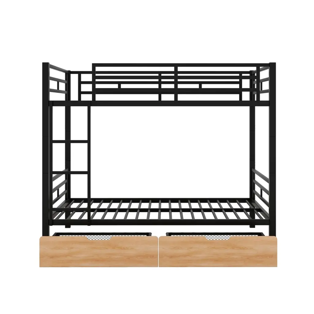 A sturdy and durable metal bed frame with full-length guardrails for safety, featuring 2 storage drawers for organization. Its detachable design allows it to be split into two independent beds, offering flexibility and space-saving solutions. Perfect for keeping rooms tidy and functional.