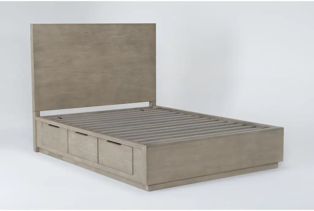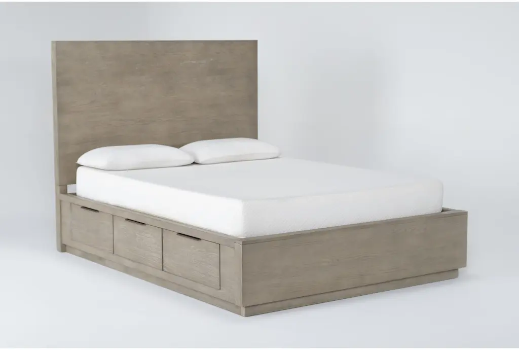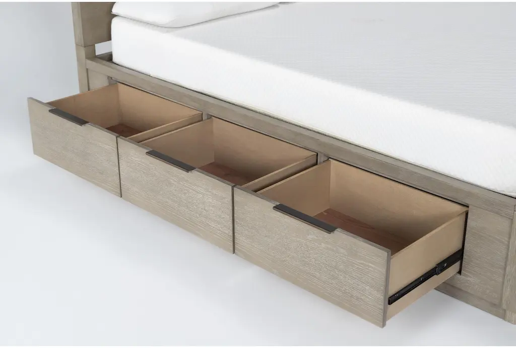Bring bold minimalism and high function to your personal retreat with our Pierce storage bed. From clean, strong lines, to a natural finish, to convenient features, this design has it all at an unbelievable value. Each side rail includes 3 drawers for a grand total of 6 drawers that can hold everything from blankets and sheets, to clothes and accessories. And thanks to a platform-style foundation, you don’t need a box spring. Hardwood and oak veneer instill strength and character, which comes through distinctly in the wood grain.
