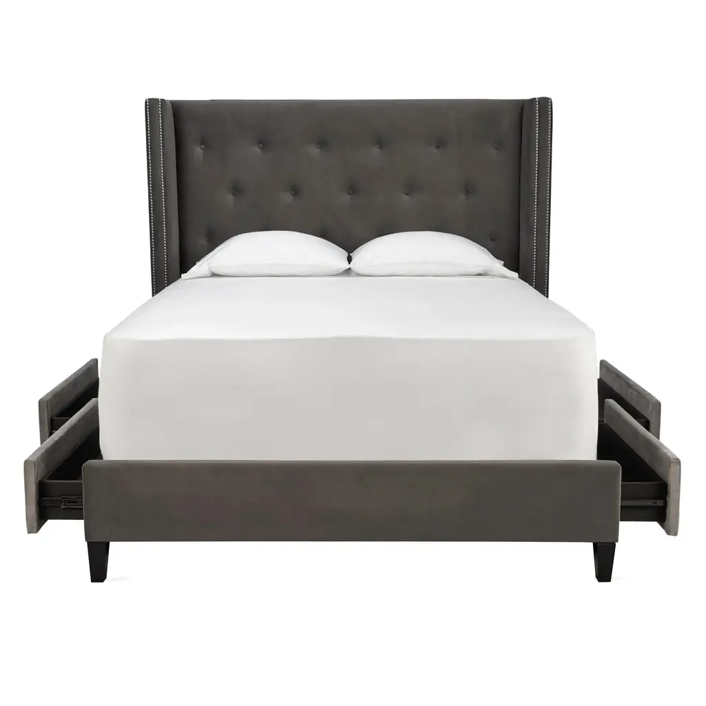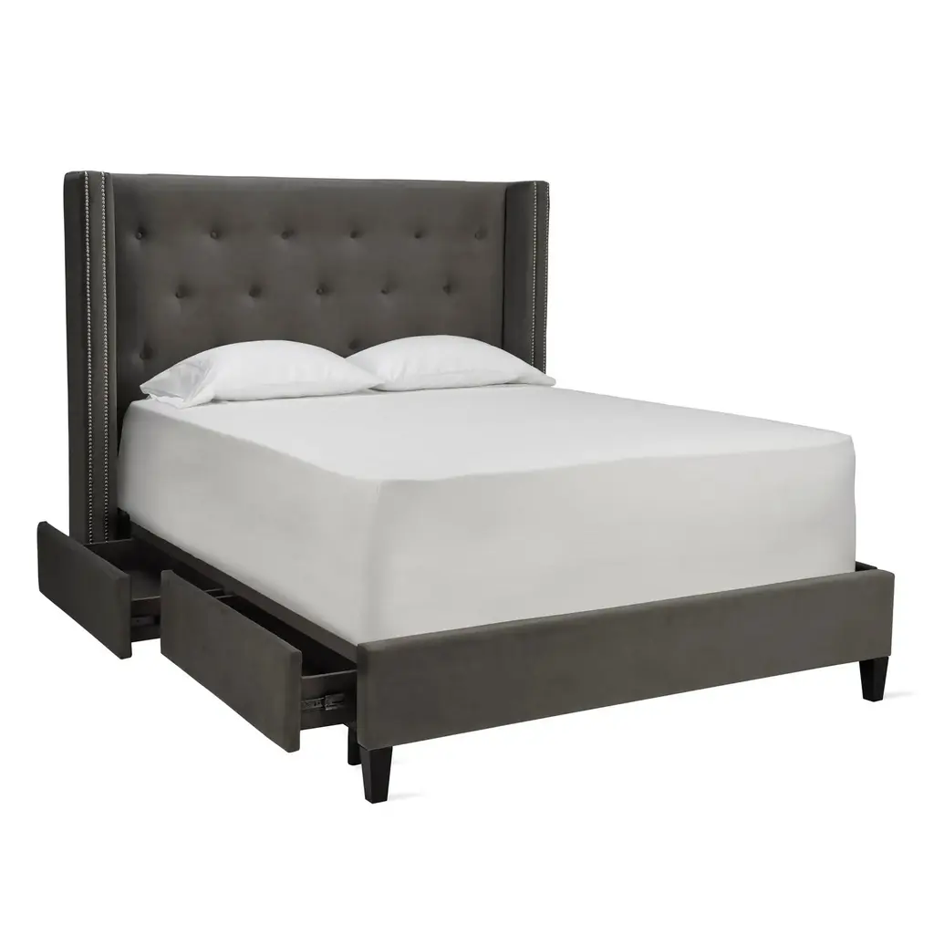Our Porter collection elevates the comforts and function of your bedroom. The clean lines and modern details make a statement in the room while the four upholstered storage drawers lend a hand for your storage needs. Shown in Bella Velvet Otter with bright nickel nailheads. Queen: 71.5"W x 86"D x 60"HEastern King: 87.5"W x 86"D x 60"HCal King: 83.5"W x 90"D x 60"HExclusive to Z Gallerie.Custom options available including over 15 fabrics and four nail head finishes as well as the option to have no nailheads. Please note that color images are for reference only.Custom Orders: Custom Furniture is manufactured especially for you, which is why we do not accept cancellations, exchanges, or returns.