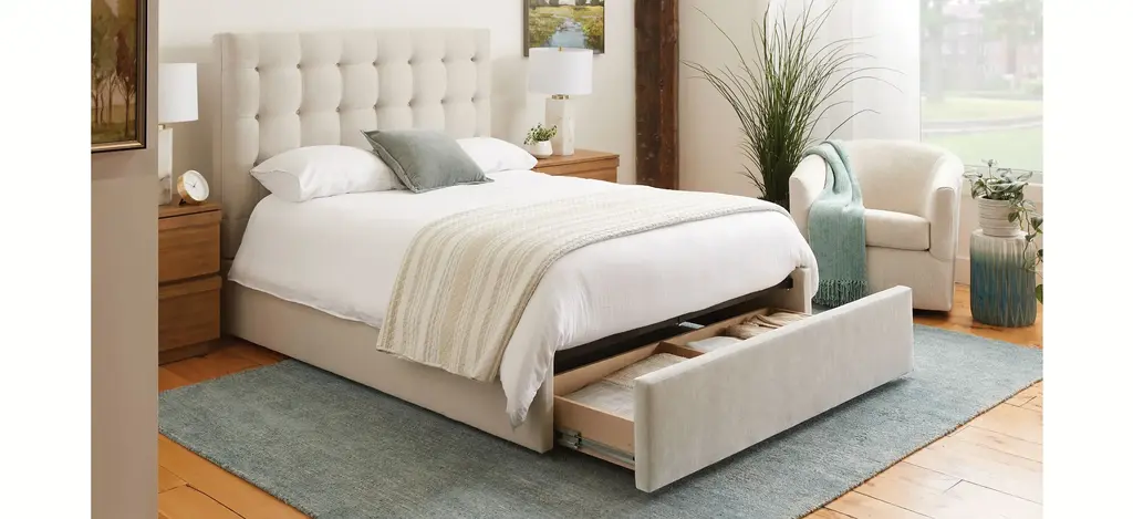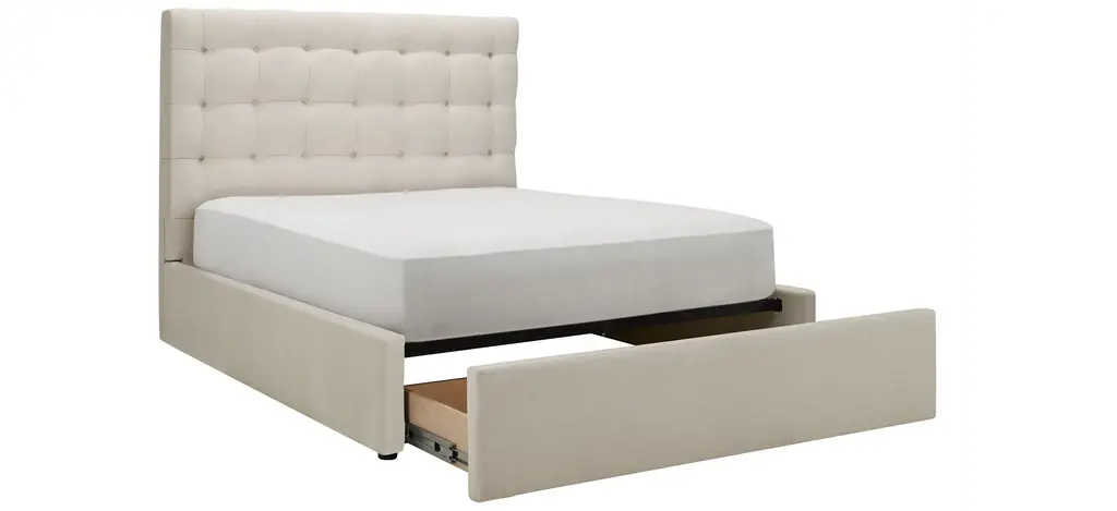 With its tufted, upholstered headboard and classic styling, the Portia Full Storage Bed makes a dreamy statement in your bedroom. Its not all about looks though. This bed also features a European curved wood slat system that flexes under your body for amazing support and pressure relief. Youll also appreciate the additional storage space, thanks to built-in drawer(s). Part of the Jonathan Louis Collection, this piece will be the focal point in your bedroom for years to come.