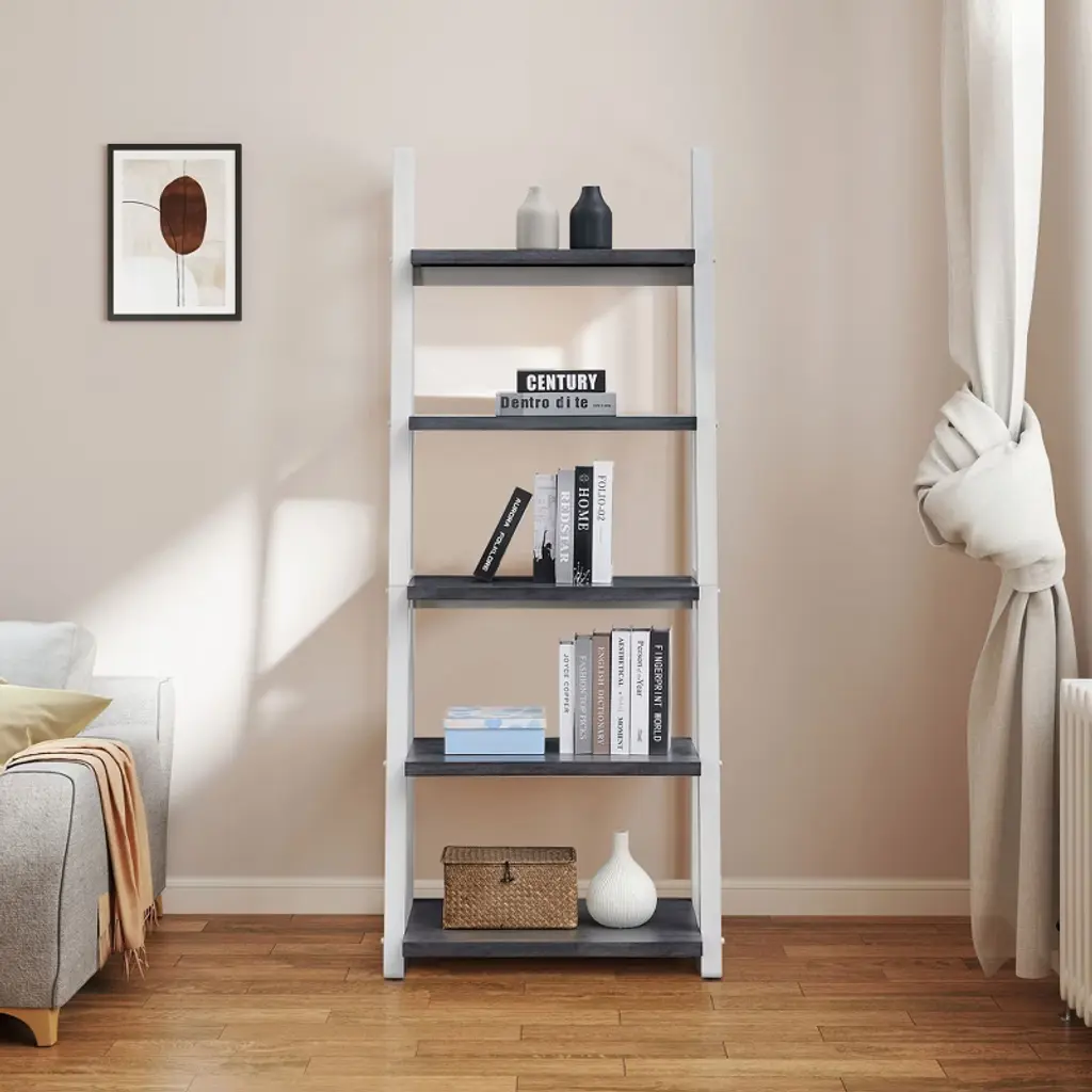 Qingmoon 5-tier Ladder Storage Rack, Wood Storage Display Rack, Freestanding Bookshelf For Living Room, Home Office, Kitchen, Bedroom - Grey+white