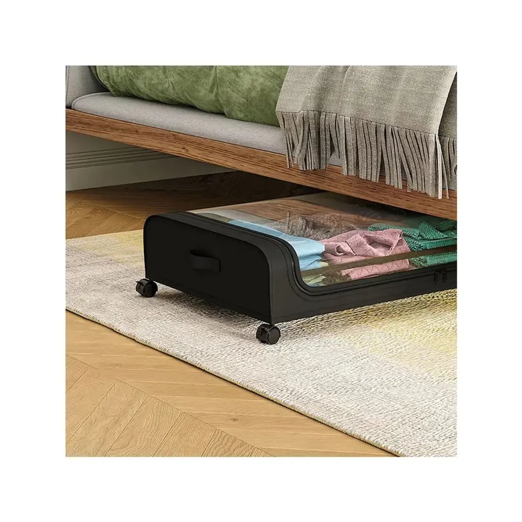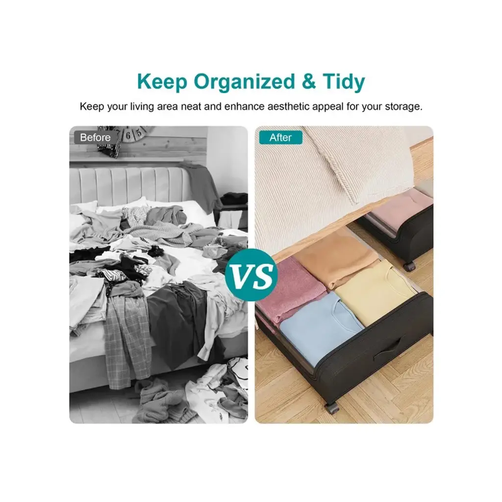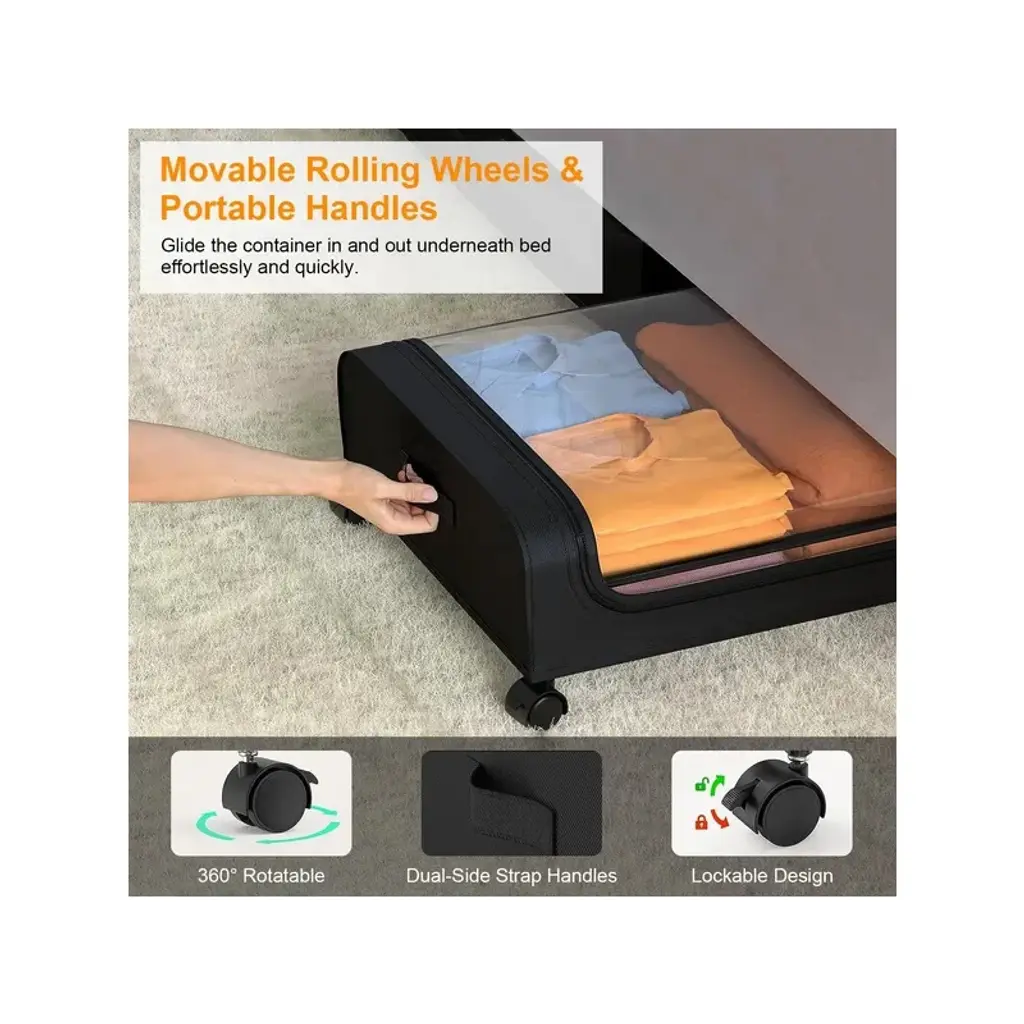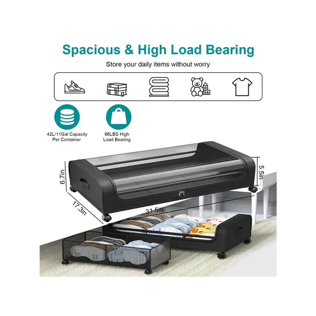 Spacious Capacity*:With size of 31.5x17.3x6.7in,each under bed organizer has about 42L/11Gal capacity,perfect to tuck away your seasonal clothing,bedding,shoes,books,toys decorations under bed,tall shelves,dresser,couch,desk,crib,sofa or other small nooks. A good choice for bedroom,dorm room,basement and more. *360¡ã Lockable Rolling Wheels*:Equipped with 4 360¡ã smooth wheels and 2 side strap handles,which allow the under bed containers to effortlessly quickly gliding in and out underneath bed when in use. With lock function on 2 wheels,simply make the storage bin stay still when place under the bed. Just press the locking mechanism lightly to lock and pull it up to unlock. *Clear Large Lid & Dual-Way Zippers*:Designed with a large PVC top lid,find your items easily and quickly as well as anti-dust and moistureproof,preserving your belongings for the long haul. Besides,the smooth dual-zippers allows you access the items easily. *Well Organized & Tidy*:With these 2 packs of under bed storage bins,you can store more of your belongings without compromising on durability or convenience,making the most out of your living area and enhancing its neatness and aesthetic appeal at the same time. *66LBS Load Bearing*:Made of robust iron frame and tear-resistant non-woven fabric,the under bed container is durable,sturdy and breathable,which is able to withstand heavy loads up to 66lbs. Allow you to store your daily items without worry,which will meet your long term storage needs.