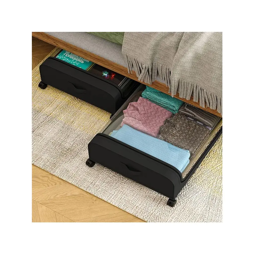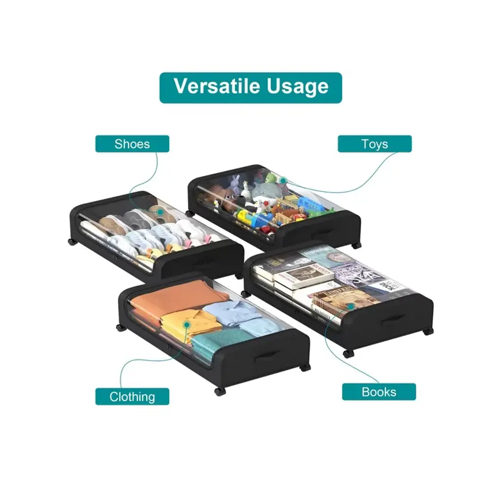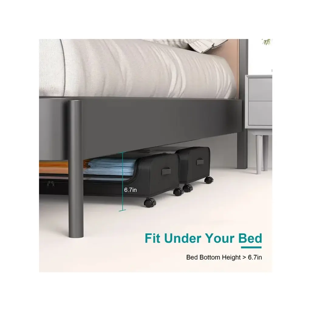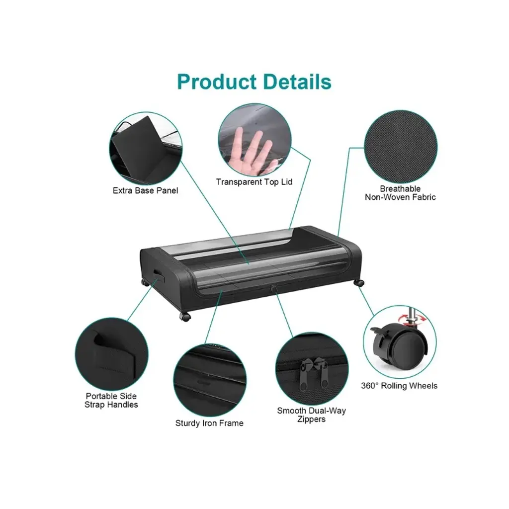 Spacious Capacity*:With size of 31.5x17.3x6.7in,each under bed organizer has about 42L/11Gal capacity,perfect to tuck away your seasonal clothing,bedding,shoes,books,toys decorations under bed,tall shelves,dresser,couch,desk,crib,sofa or other small nooks. A good choice for bedroom,dorm room,basement and more. *360¡ã Lockable Rolling Wheels*:Equipped with 4 360¡ã smooth wheels and 2 side strap handles,which allow the under bed containers to effortlessly quickly gliding in and out underneath bed when in use. With lock function on 2 wheels,simply make the storage bin stay still when place under the bed. Just press the locking mechanism lightly to lock and pull it up to unlock. *Clear Large Lid & Dual-Way Zippers*:Designed with a large PVC top lid,find your items easily and quickly as well as anti-dust and moistureproof,preserving your belongings for the long haul. Besides,the smooth dual-zippers allows you access the items easily. *Well Organized & Tidy*:With these 2 packs of under bed storage bins,you can store more of your belongings without compromising on durability or convenience,making the most out of your living area and enhancing its neatness and aesthetic appeal at the same time. *66LBS Load Bearing*:Made of robust iron frame and tear-resistant non-woven fabric,the under bed container is durable,sturdy and breathable,which is able to withstand heavy loads up to 66lbs. Allow you to store your daily items without worry,which will meet your long term storage needs.