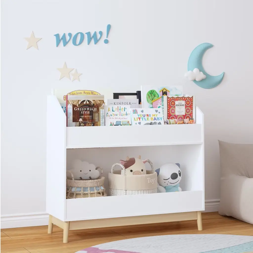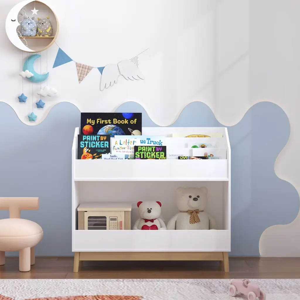 Large Capacity Storage ¨C This kids¡¯ bookshelf is designed with 3 spacious tiered book display compartments and an oversized bottom storage shelf, offering plenty of room for books, toys, and learning essentials. Organize More in One Place ¨C Unlike small book organizers, this extra-large bookcase can hold dozens of picture books, storybooks, and activity sets, keeping your child¡¯s room neat and clutter-free. Modern Look for Any Room ¨C With its minimalist white design and natural wood legs, this large storage bookcase blends seamlessly into playrooms, bedrooms, classrooms, or nurseries. Durable & Stable Construction ¨C Made from sturdy engineered wood with a smooth white finish, the bookshelf provides long-lasting use and remains stable even when fully loaded. 2-in-1 Multifunctional Storage ¨C Combines a 3-tier kids¡¯ book display with a spacious bottom open storage bin, perfect for organizing books, toys, plushies, and more in one convenient unit.