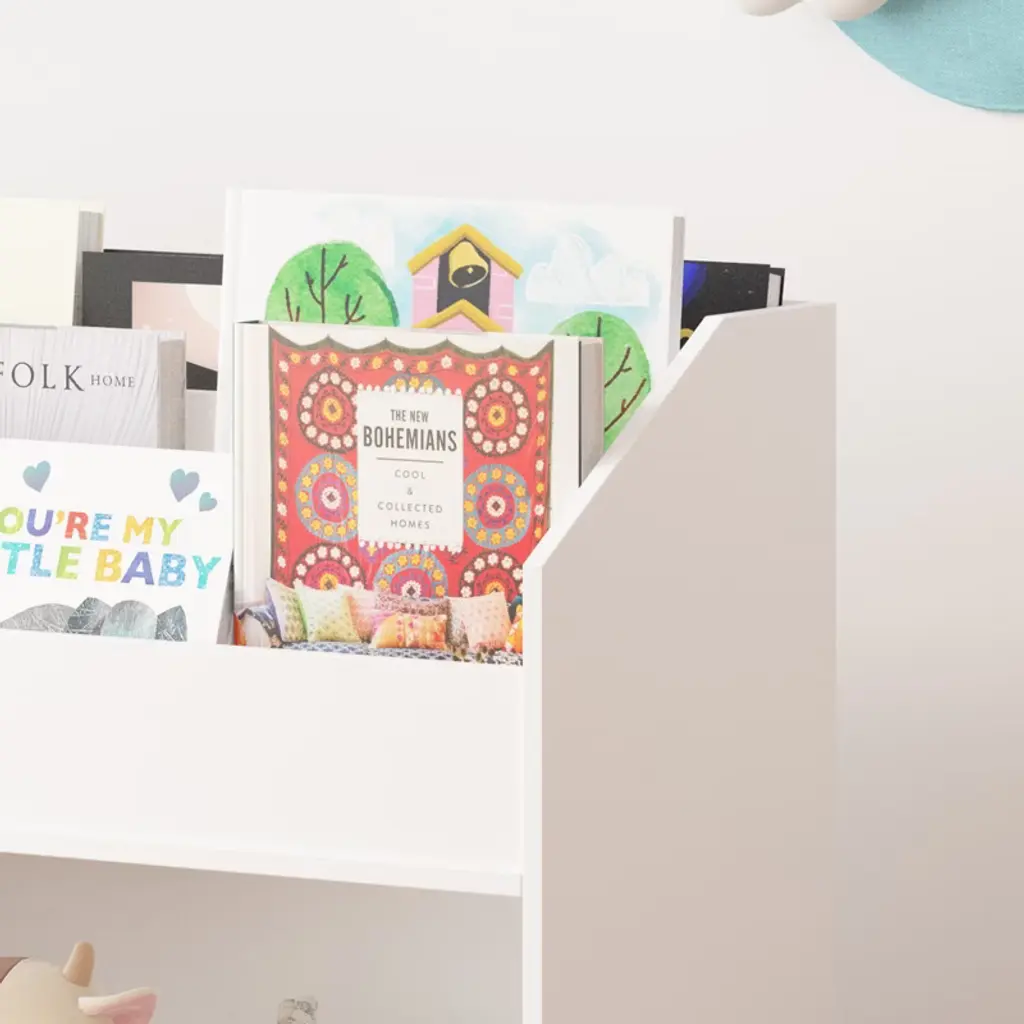 Racxily Toddler Book Display Shelf With Storage, Wooden Kids Bookcase Organizer For Bedroom Or Playroom, White