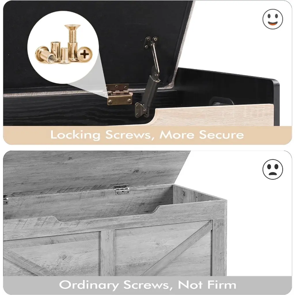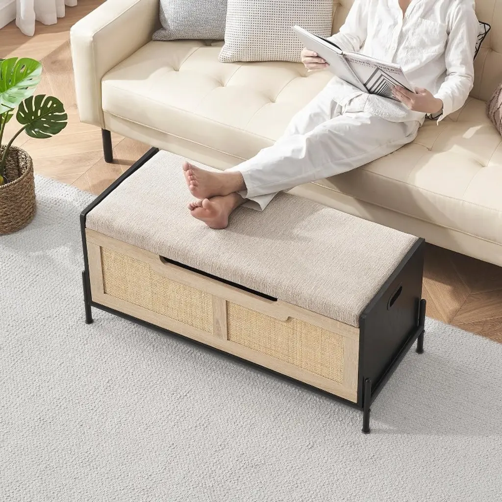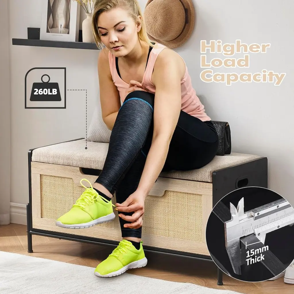 Enhance your living space with this versatile rattan storage bench, combining style, functionality, and comfort. The flip-top lid reveals ample storage for shoes, clothes, books, or household essentials, while the cushioned top offers a comfortable seat or footrest. Designed with safety in mind, two hinges prevent the lid from slamming, and the U-shaped skeletonized design ensures easy access without pinching fingers. Portable side handles make relocation effortless. Built from premium particleboard with 15mm wall panels, this storage bench supports up to 260 lbs. Ideal for entryways, living rooms, or bedrooms, it combines practical storage, seating, and elegance in one stylish piece.