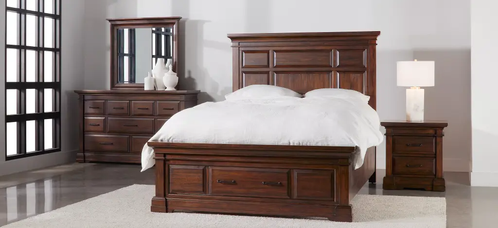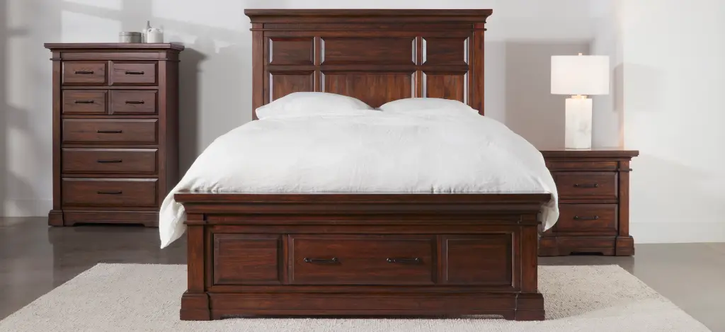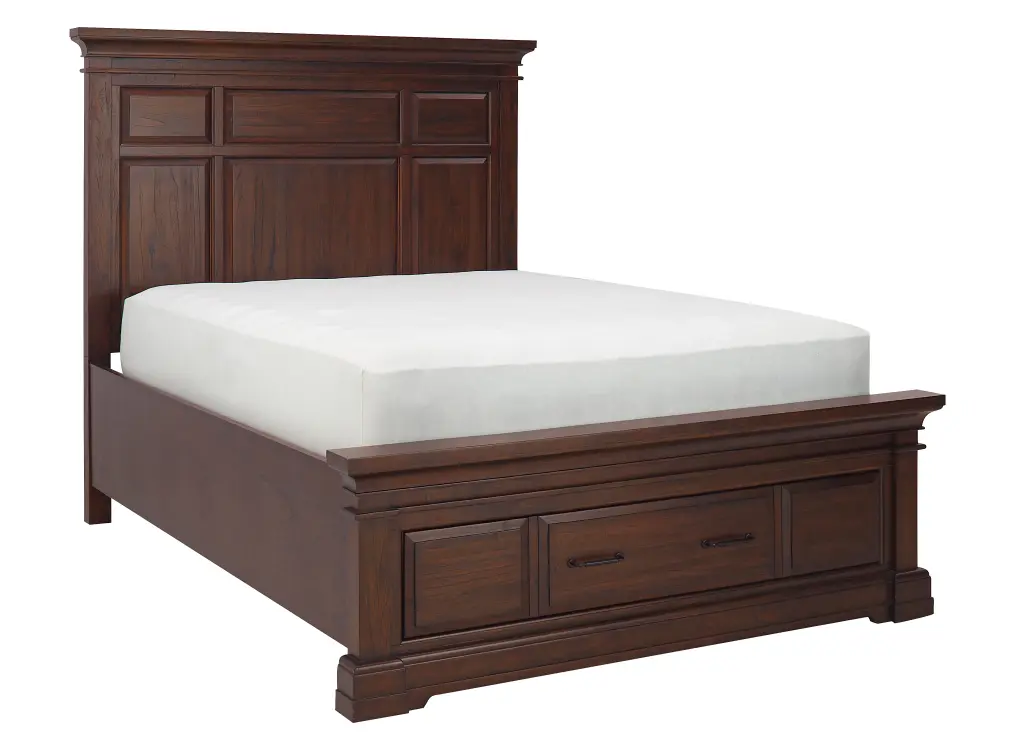 Wish you had more storage space? Make your storage dreams come true with this Richmond King Platform Storage Bed. A large footboard storage drawer with dividers provides ample space for essentials. This gorgeous bed, with its dark, rich finish, looks wonderful in a traditional style bedroom setting.